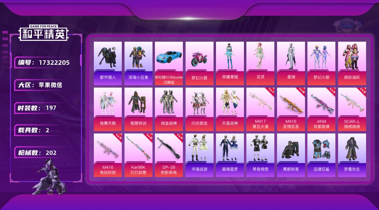 [17322205]苹果 微信-11粉装-9特效枪-2载具-3粉色飞行器-67713热力值-8王牌印记-197套装-202枪皮 【热门品类】:粉装-梦幻火箭,粉装-缤纷油彩,套装-浪漫天命,套装-都市猎人,套装-深海小丑鱼,套装-小丑鱼,套装-忍者信条,套装-龟仙人,套装-暗影哥特,角色-8号机,角色-Mark.06,套装-红熊茄茄 【粉色套装】:粉装-独舞天鹅,粉装-极限特训,粉装-梦幻火箭,粉装-缤纷油彩,粉装-绚金战神,粉装-闪光银龙,粉装-天星战神,角色-花灵,角色-星渊,角色-异瞳寒姬,人物-小舞·恋语 【粉色枪皮等级】:AKM-炫紫旋律(五级),SCAR-L-锦绣绵绵(五级),M416-至情至圣(六级),M416-电玩时刻(五级),UMP45-萌骑冒险(三级),Kar98K-巳巳如意(五级),Mk14-福马献瑞(四级),M417-第五大道(七级),DP-28-豹影疾电(四级) 【粉色载具】:保时捷918 Spyder(沉静蓝),双人摩托-梦幻火箭 【粉色枪皮】:AKM-炫紫旋律,SCAR-L-锦绣绵绵,M416-至情至圣,M416-电玩时刻,UMP45-萌骑冒险,Kar98K-巳巳如意,Mk14-福马献瑞,M417-第五大道,DP-28-豹影疾电 【粉色飞行器】:香车宝马飞行器,炫彩糖果飞行器,夜幕颂歌飞行器 【粉色降落伞】:幻影战神降落伞,梦幻火箭降落伞,夏日绵绵冰降落伞,垂柳戏鸭降落伞,第五大道降落伞,仲夏莫吉托降落伞,白勺歌姬降落伞,祥瑞锦鲤降落伞,江南烟雨降落伞,精灵梦叶罗丽降落伞,冠军兔兔降落伞,忍者神龟降落伞,千金淑猫降落伞,圣域龙灵降落伞,异瞳寒姬降落伞,炫彩糖果降落伞,谜鸦审判降落伞,小舞降落伞 【稀有套装】:套装-龟仙人,套装-巳巳如意,套装-雪国风尚,角色-奈斯,角色-魂电,角色-罗莉,角色-幸运青,角色-X,角色-阿虎,套装-马上有钱,套装-雏菊兔兔,套装-萝兰蝴蝶,套装-小熊娃娃,角色-都市丽猫,套装-晶辉守护,套装-诡诞巡游,套装-混沌火种,套装-书海巡游,套装-画境星梦,套装-琴音绮想,套装-雨过天青,套装-红釉青花,角色-幻步猫灵,角色-曹焱兵,角色-唐三,角色-朱竹清 【稀有枪皮】:AKM-彩虹符号,AKM-影袭,AKM-破晓战魂,AKM-龙的传人,M16A4-幻世战舞者,SCAR-L-夜灯,SCAR-L-玉兔迎春,SCAR-L-红色方程式