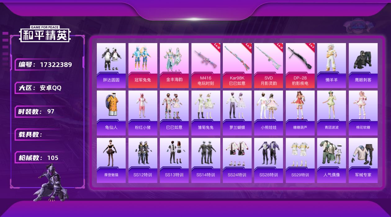 [17322389]安卓 手Q-2粉装-4特效枪-0载具-1粉色飞行器-33073热力值-4王牌印记-97套装-105枪皮 【热门品类】:套装-胖达圆圆,套装-龟仙人,套装-粉红小猪 【粉色套装】:粉装-冠军兔兔,粉装-金丰海韵 【粉色枪皮等级】:M416-电玩时刻(五级),Kar98K-巳巳如意(五级),SVD-月影灵韵(三级),DP-28-豹影疾电(一级) 【粉色枪皮】:M416-电玩时刻,Kar98K-巳巳如意,SVD-月影灵韵,DP-28-豹影疾电 【粉色飞行器】:冠军兔兔飞行器 【粉色降落伞】:精灵梦叶罗丽降落伞,冠军兔兔降落伞,守护天翼降落伞,千金淑猫降落伞 【稀有套装】:套装-龟仙人,套装-巳巳如意,套装-雏菊兔兔,套装-萝兰蝴蝶,套装-小熊娃娃,套装-糖糖葫芦,套装-青团波波,套装-棉花软糖,角色-摩登魅猫,玩偶服-懒羊羊 【稀有枪皮】:AKM-夜灯,AKM-破晓战魂,SCAR-L-夜灯,SCAR-L-炫彩节奏,SCAR-L-粉锦千层,M416-红色方程式,M416-蓝色火焰,GROZA-懵萌河马,AUG-天降萌叽,AUG-耀粉歌者,QBZ-彩虹符号,M762-彩虹符号,M762-牛气冲天,M762-第五大道,G36C-懵萌河马,AC-VAL-天降萌叽,蜜獾-天降萌叽,UZI-天降萌叽,UZI-红色方程式,UMP45-涂山之恋,UMP45-蓝色火焰,Vector-彩虹符号,汤姆逊-耀粉歌者,MP5K-飒粉甜心,P90-巳巳如意,Kar98K-彩虹符号,Mini14-炫彩节奏,Mini14-耀粉歌者,莫辛纳甘-懵萌河马,S686-彩虹符号,S686-生命誓言,S686-千金淑猫,S12K-玩趣呆呆,S12K-破晓战魂,S12K-夜灯,S12K-幻世战舞者,DBS-彩虹符号,DBS-创世·救赎,M249-糯团青竹,MG3-幻世战舞者,MG3-第五大道,PKM-懵萌河马,蝎式手枪-千金淑猫 【其他套装】:套装-SS12特训,套装-SS13特训,套装-SS14特训,套装-SS24特训,套装-SS28特训,套装-SS29特训,套装-人气偶像,套装-军械专家,套装-完美偶像,套装-幻世战舞者,套装-幻影武者,套装-怒火燎原,套装-旭日情侣,套装-极速红龙,套装-沙漠雄狮,套装-深蓝色名流,套装-湖蓝色名流,套装-潮流炫酷,套装-牛气冲天,套装-牛气满满,套装-特殊使命,套装-特训