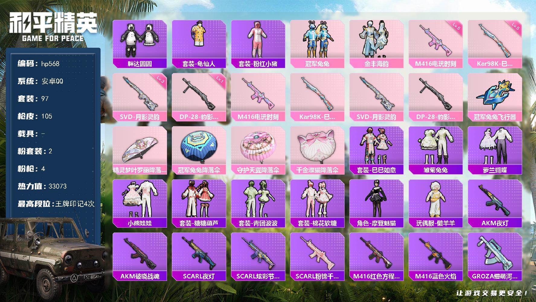 [17322389]安卓 手Q-2粉装-4特效枪-0载具-1粉色飞行器-33073热力值-4王牌印记-97套装-105枪皮