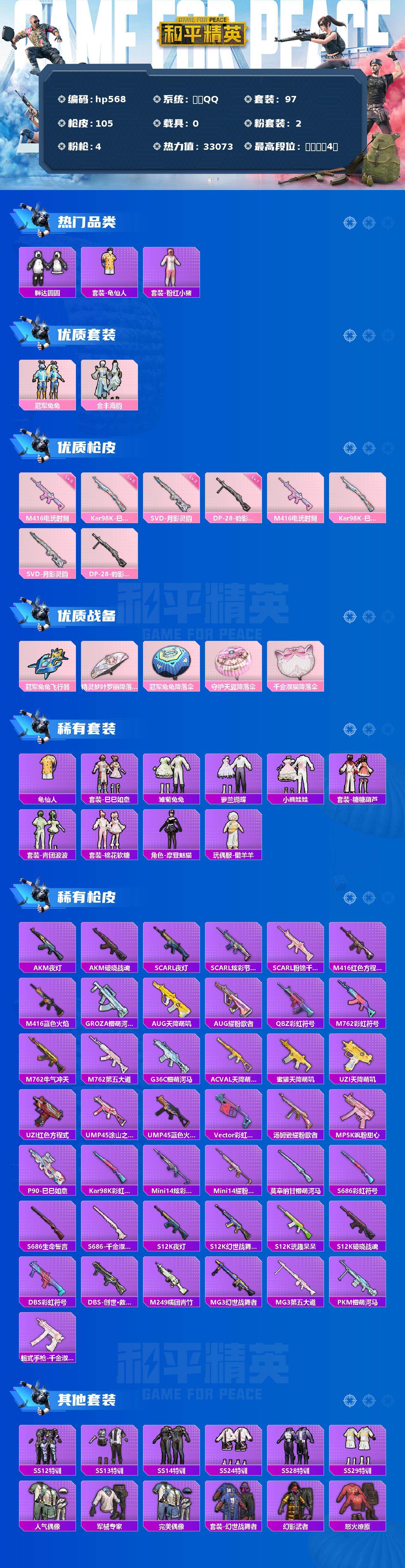 - [16137958]【特价出售/店主推荐】安卓 手Q-4粉装-3特效枪-0载具-3粉色飞行器-41162热力值-9王牌印记-95套装-138枪皮 【热门品类】:粉装-梦幻火箭,套装-龟仙人 【粉色套装】:粉装-天使彩虹糖,粉装-梦幻火箭,粉装-薄荷物语,角色-萨利娅 【粉色枪皮等级】:Kar98K-未来歌姬(五级),Kar98K-巳巳如意(一级),DP-28-豹影疾电(五级) 【粉色枪皮】:Kar98K-未来歌姬,Kar98K-巳巳如意,DP-28-豹影疾电 【粉色飞行器】:梦幻火箭飞行器,庄周梦蝶飞行器 【粉色降落伞】:绝对恒星降落伞,甜心宝贝降落伞,梦幻火箭降落伞,庄周梦蝶降落伞,环太平洋降落伞,彩虹甜喵降落伞,第五大道降落伞 【稀有套装】:套装-龟仙人,套装-巳巳如意,套装-雪国风尚,角色-都市丽猫,套装-燕燕于飞,套装-鱼渊荷华,套装-星渊小夜曲,套装-炫彩糖果 【稀有枪皮】:AUG-冰晶雪宝,AKM-虎虎生威,AKM-龙的传人,M16A4-幻世战舞者,M16A4-红色方程式,SCAR-L-炫彩节奏,SCAR-L-玉兔迎春,SCAR-L-红色方程式,M416-糯团青竹,M416-红色方程式,M416-绯红前夜,M416-蓝色火焰,GROZA-治愈之星,GROZA-田园牧歌,GROZA-荧海星豚,AUG-耀粉歌者,AUG-绝对恒星,QBZ-彩虹符号,QBZ-飞驰魅影,M762-天降萌叽,M762-甜心宝贝,AC-VAL-天降萌叽,蜜獾-天降萌叽,蜜獾-娇憨猪猪,UZI-啾咪啾咪,UZI-天降萌叽,UZI-娇憨猪猪,UZI-红色方程式,UMP45-生命誓言,UMP45-蓝色火焰,UMP45-绒宝小鹅,Vector-暗夜玫瑰,Vector-治愈之星,Vector-生命誓言,Vector-田园牧歌,汤姆逊-天降萌叽,汤姆逊-庄周梦蝶,汤姆逊-耀粉歌者,野牛-王牌四分卫,MP5K-彩虹嘻嘻猴,MP5K-甜蜜誓约,P90-飞驰魅影,P90-巳巳如意,Kar98K-彩虹符号,Kar98K-梦幻火箭,Kar98K-炫彩节奏,Kar98K-飞驰魅影,M24-治愈之星,AWM-庄周梦蝶,SKS-炫彩节奏,VSS-田园牧歌,Mini14-彩虹嘻嘻猴,Mini14-耀粉歌者,Mk14-治愈之星,SLR-娇憨猪猪,AMR-鬼刀,S686-生命誓言,S686-巳巳如意,S686-千金淑猫,S1897-炫