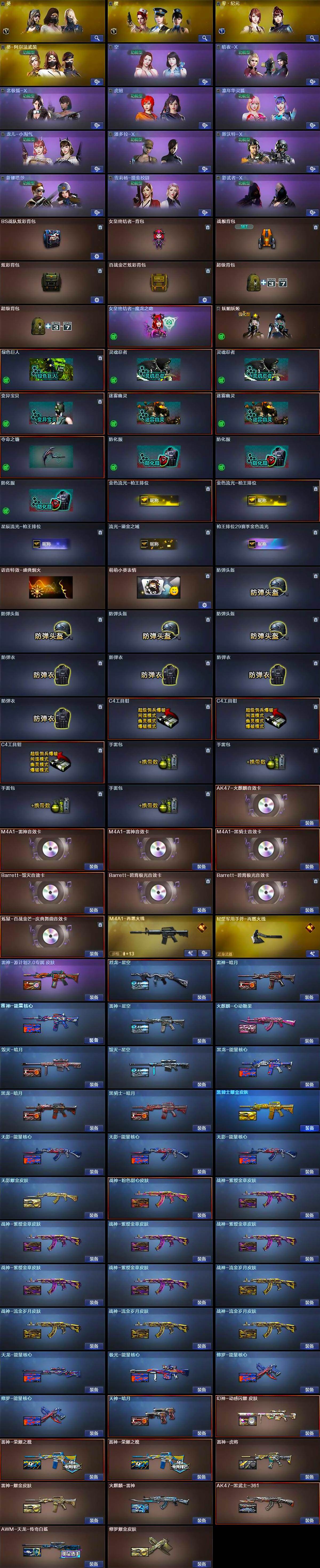 【皮肤】:幻神-动感闪耀 皮肤,烈龙-星空,雷神-暗月,雷神-能量核心,雷神-荣耀之魄*2,雷神-星空,雷神-虎将,雷神-耀金皮肤,雷神-源计划2.0专属 皮肤,M4A1-再燃火线,火麒麟-雷神,火麒麟-心动糖果,毁灭-暗月,毁灭-星空,黑龙-能量核心,黑龙-暗月,黑骑士-暗月,黑骑士耀金皮肤,无影-能量核心*3,无影耀金皮肤,AK47-黑武士-361,战神-粉色甜心皮肤,战神-紫绶金章皮肤*6,战神-流金岁月皮肤*4,天龙-能量核心,AWM-天龙-传奇白鲨,极光-能量核心,修罗-能量核心*2,修罗耀金皮肤,天神-暗月,轻型军用手斧-再燃火线