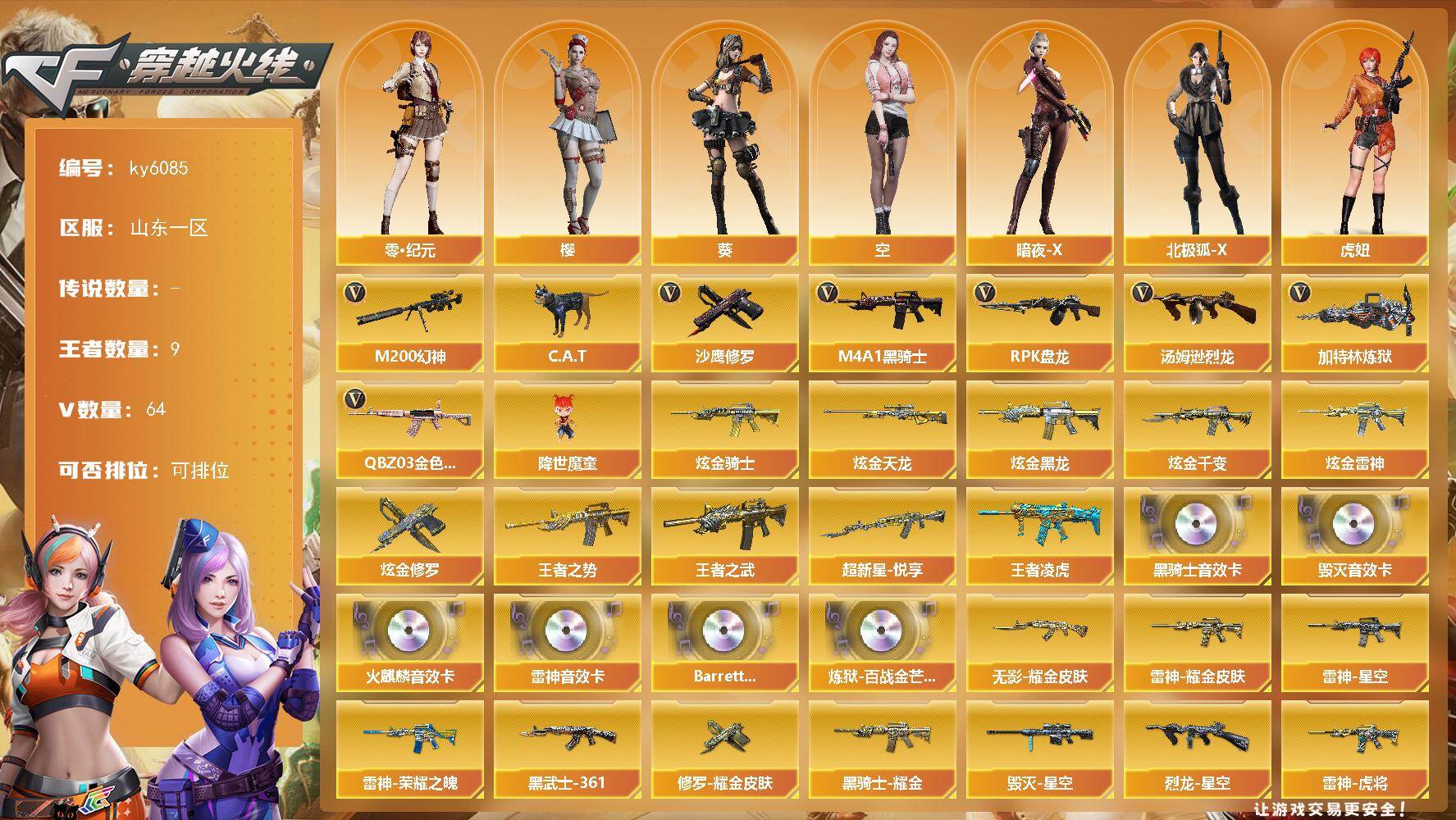 [17322663]山东一区-69V-9王者武器数-7炫金武器数 【热门武器】:QBZ03-金色蔷薇,M200-幻神,C.A.T,M4A1-黑骑士*4,汤姆逊-烈龙,RPK-盘龙*2,加特林-炼狱,降世魔童,沙鹰-修罗 【王者炫金武器】:超新星-悦享*2,王者之势,王者之武,王者凌虎,炫金骑士,炫金黑龙*2,炫金千变,炫金雷神,炫金天龙,炫金修罗 【音效卡】:AK47-火麒麟音效卡,M4A1-雷神音效卡*2,M4A1-黑骑士音效卡,Barrett-毁灭音效卡,Barrett-碧霄极光音效卡*2,炼狱-百战金芒-庆典舞曲音效卡 【皮肤】:幻神-动感闪耀 皮肤,烈龙-星空,雷神-暗月,雷神-能量核心,雷神-荣耀之魄*2,雷神-星空,雷神-虎将,雷神-耀金皮肤,雷神-源计划2.0专属 皮肤,M4A1-再燃火线,火麒麟-雷神,火麒麟-心动糖果,毁灭-暗月,毁灭-星空,黑龙-能量核心,黑龙-暗月,黑骑士-暗月,黑骑士耀金皮肤,无影-能量核心*3,无影耀金皮肤,AK47-黑武士-361,战神-粉色甜心皮肤,战神-紫绶金章皮肤*6,战神-流金岁月皮肤*4,天龙-能量核心,AWM-天龙-传奇白鲨,极光-能量核心,修罗-能量核心*2,修罗耀金皮肤,天神-暗月,轻型军用手斧-再燃火线 【角色】:葵,樱,零·纪元,葵-阿尔法武装,空,暗夜-X,北极狐-X,虎妞,嘉年华灵狐,龙儿-小淘气,潘多拉-X,斯沃特-X,新娜塔莎,雪莉杨-摸金校尉,影武者-X 【人偶武器】:火麒麟-灵狐,M4A1-雷神-精英刀锋,AWM-灵狐-15周年嘉年华,COP-旗袍,C.A.T,迷你裂空之翼,迷你波特博士,夺魂,迷你生化手雷,闪光弹-小乔,迷你巨石泰坦-魔花研究所,降世魔童 【暴走生化】:超级对讲机 【挑战大师】:AK47-冰龙粉碎者,冰龙粉碎者-白马银枪,激光毁灭者III-白马银枪,激光毁灭者III,试炼破坏者III 【英雄级武器】:AK47-火麒麟*2,AK47-麒麟,M4A1-黑龙,M4A1-雷神,M4A1-黑骑士*4,AK47-无影,AK47-黑武士,AN94-超新星,无影-神兵利器,QBZ03-金色蔷薇,M4A1-猎神,9A91-烈火,王者之心-觉醒版,王者之魄-觉醒版,AK-47-猩红传说*8,AK47-B-战神,机械迷城-穹宇,AWM-天龙,Barrett-毁灭,Barrett-极光,AWM-裁决*2,M200-