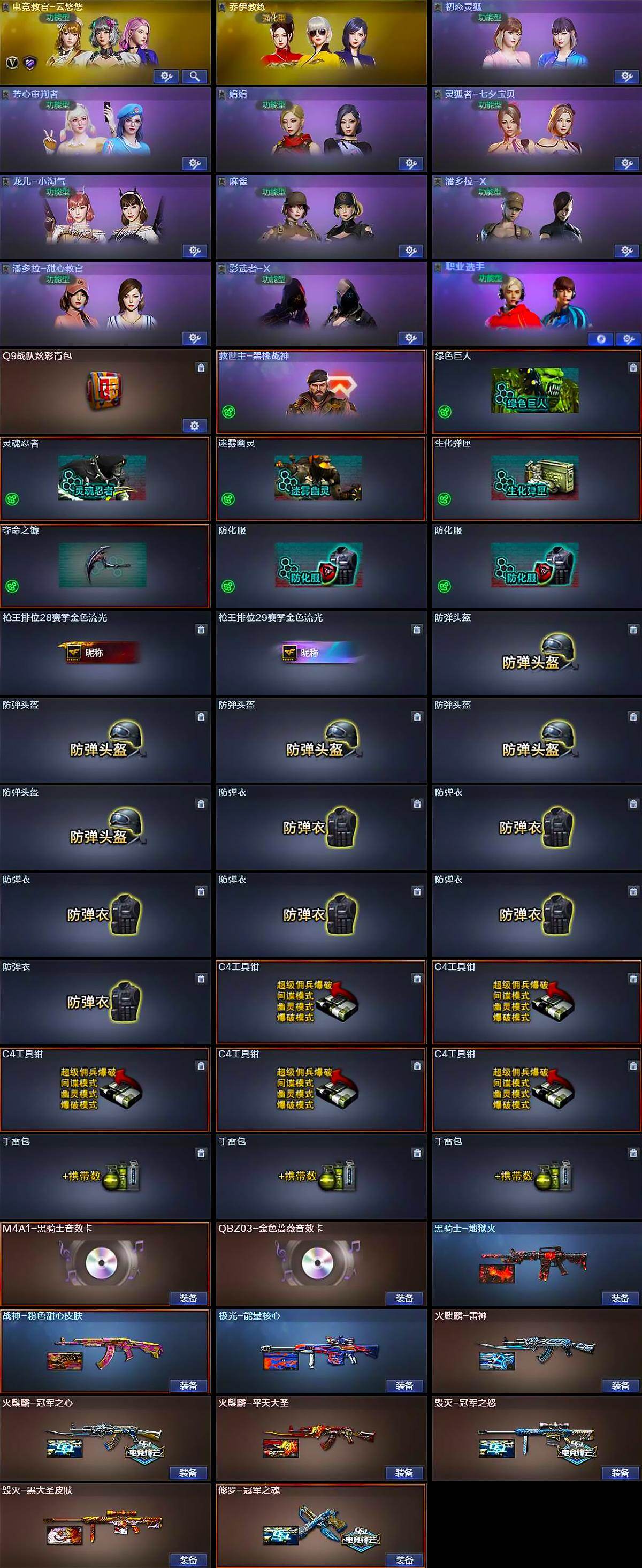 【道具】:Q9战队炫彩背包,救世主-黑桃战神,绿色巨人,灵魂忍者,迷雾幽灵,生化弹匣,夺命之镰,防化服*2,枪王排位28赛季金色流光,枪王排位29赛季金色流光,防弹头盔*5,防弹衣*6,C4工具钳*5,手雷包*3