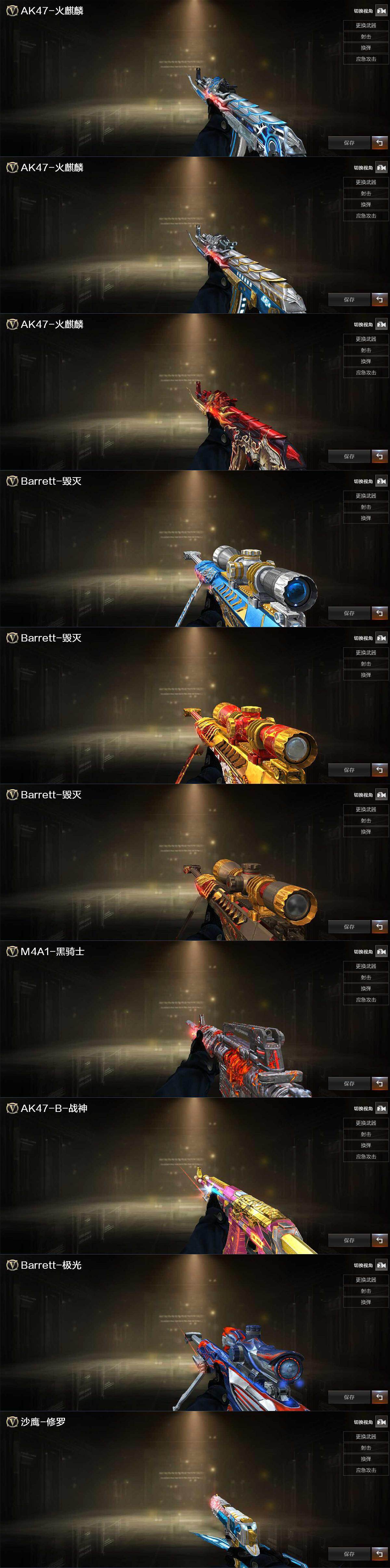 【英雄级武器】:AK47-火麒麟,M4A1-黑骑士,AN94-超新星,M4A1-龙血,HK417-朱雀,M14EBR-玄武,黑武士-锦绣游龙,QBZ03-金色蔷薇,9A91-烈火,王者之心-觉醒版,王者之势-觉醒版,黑骑士-海王,王者龙血-觉醒版,Barrett-毁灭,M200-竞技荣光,加特林-炼狱,沙鹰-修罗,USP-雷暴,柯尔特-冠军之特*2,柯尔特-竞技荣光*3,屠龙,麒麟刺*3,擎天-竞技荣光*3,高爆手雷-竞技荣光*5,闪光弹-竞技荣光*4,烟雾弹-竞技荣光*2