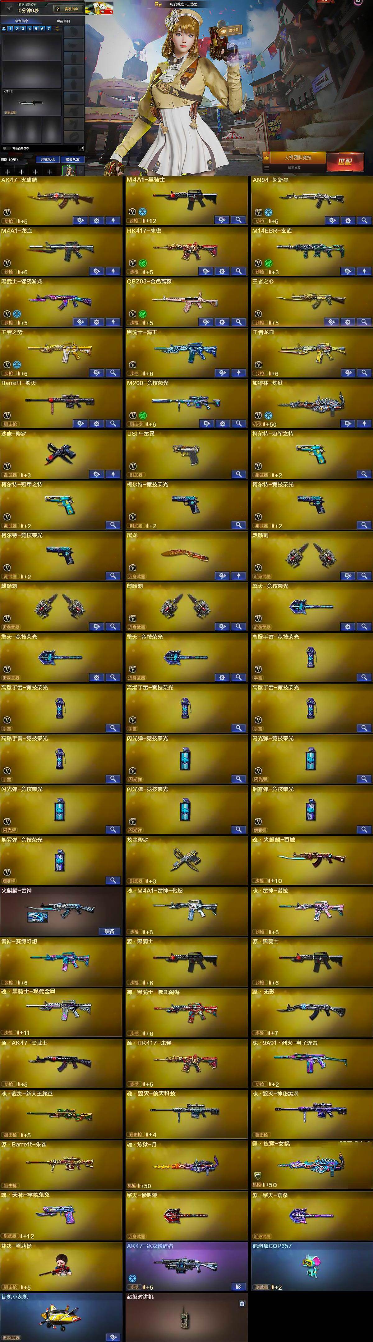 - [12555930]【商品标题】:安徽一区-43V-2王者-0炫金 【热门武器】:QBZ03-金色蔷薇,Scar Light-白虎,M200-竞技荣光,白虎-电玩蓝兔,M4A1-黑骑士,USP-雷暴 【稀有皮肤】:金色蔷薇-破浪逐光 皮肤,M4A1-战神赵云,火麒麟-轻羽皮肤,火麒麟-平天大圣,火麒麟-心动糖果,黑骑士-战神马超 【角色】:王者影豹,幽,电竞教官-云悠悠,鹰,蜀雪,炽天使,青霞仙子 【人偶武器】:AWM-灵狐-15周年嘉年华,迷你超能女侍,迷你巨石泰坦-魔花研究所,迷你裂空之翼,迷你波特博士,迷你曼提柯尔,夺魂,迷你牛牛,迷你火种,生化手雷-机甲核心,深渊终结者手雷 【暴走生化】:双面神,超级对讲机 【挑战大师】:神圣爆裂者III,机甲撕裂者III*2,神圣爆裂者-末日III*2,阐释者III,试炼破坏者III*3,激光毁灭者III*2,VEPR-12-金魔,激光毁灭者III-白马银枪,冰龙粉碎者-白马银枪 【英雄级武器】:唐刀-神工天巧,M200-竞技荣光,柯尔特-竞技荣光,擎天-竞技荣光,高爆手雷-竞技荣光*5,烟雾弹-竞技荣光*4,闪光弹-竞技荣光*6,USP-雷暴,烈火-动感闪耀,天神-动感闪耀,屠龙-动感闪耀,手雷-动感闪耀,QBZ03-金色蔷薇,Scar Light-白虎,白虎-电玩蓝兔,M4A1-雷神,M4A1-黑龙,M4A1-黑骑士,AK47-火麒麟,AK47-黑武士,AWM-裁决,超新星-热带奇洋,AK-47-猩红传说,AK47-B-战神,AK47-B-常胜将军,修罗-云海游龙,龙啸-热带奇洋 【特殊枪械】:1白虎,1黑骑士