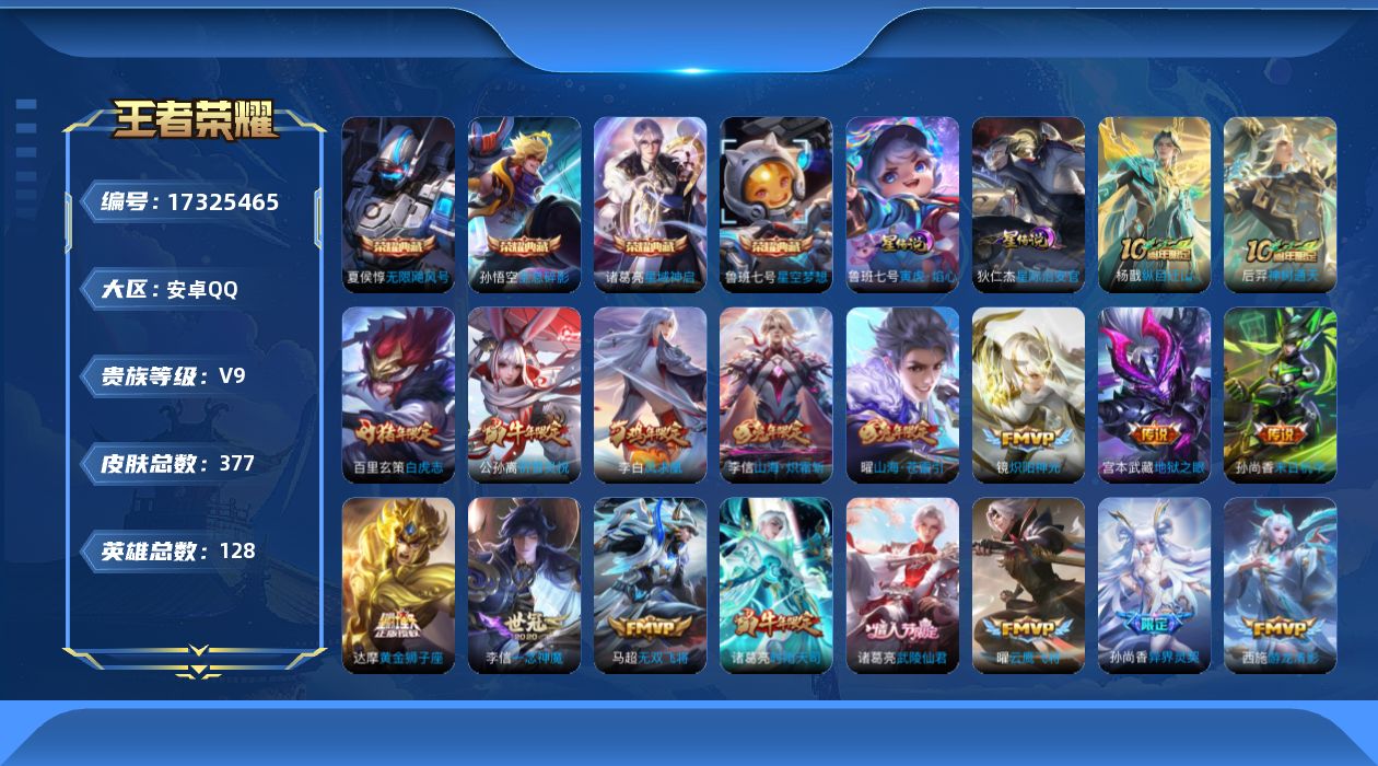 [17325465]【特价出售/店主推荐】安卓Q-V9-至尊星耀V段位-128英雄-377皮肤-4典藏皮肤-2星传说-1典藏英雄-40传说-109史诗