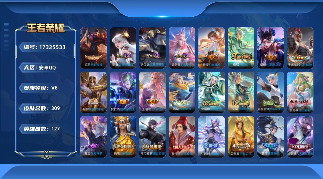 [17325533]【特价出售/店主推荐,中路50段,发育路40段,3省标,7市标】安卓Q-V6-至尊星耀II段位-127英雄-309皮肤-3星传说-1典藏皮肤-7传说-94史诗