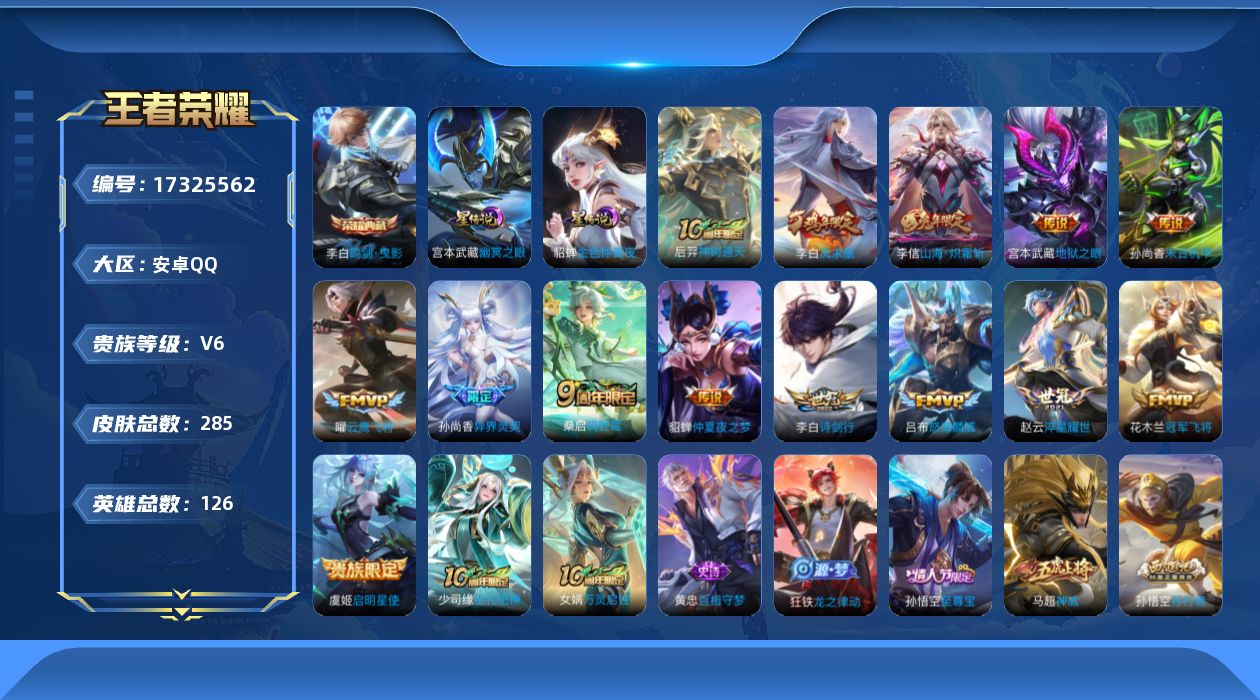 [17325562]【特价出售/店主推荐/34段对抗/31段打野】:安卓Q-V8-永恒钻石II段位-126英雄-285皮肤-1典藏皮肤-2星元-14传说-85史诗
