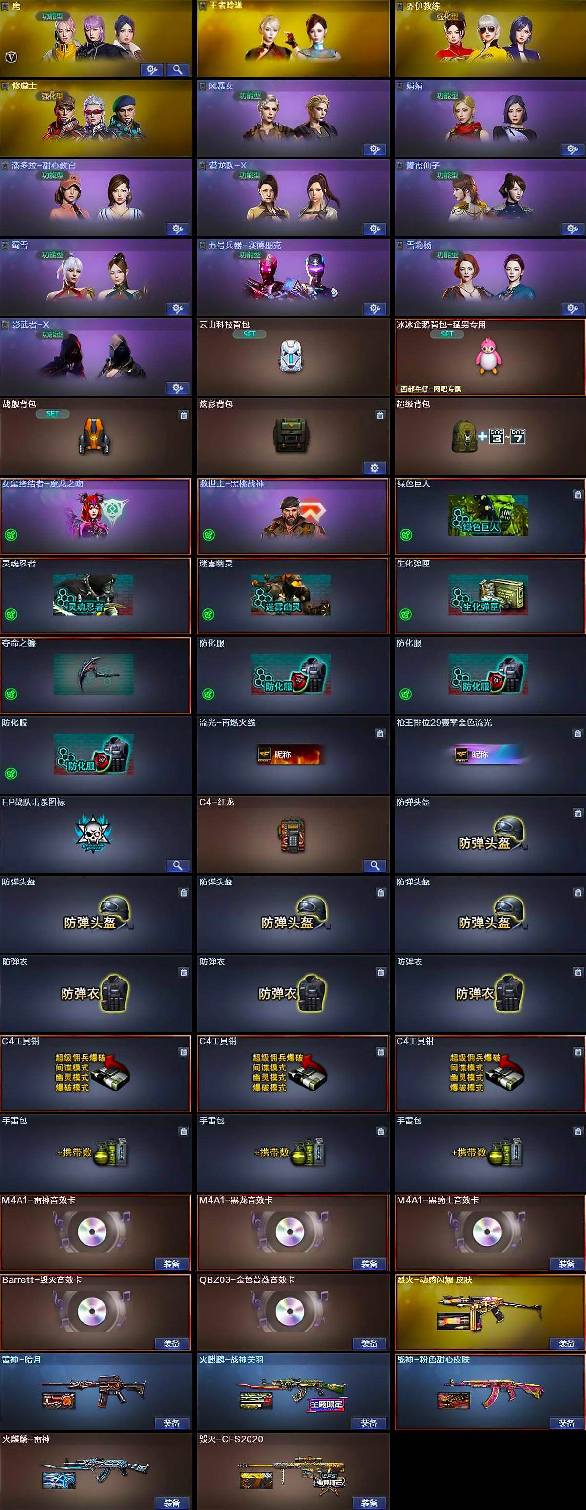 【道具】:云山科技背包,冰冰企鹅背包-猛男专用,战舰背包,炫彩背包,超级背包,女皇终结者-魔龙之吻,救世主-黑桃战神,绿色巨人,灵魂忍者,迷雾幽灵,生化弹匣,夺命之镰,防化服*3,流光-再燃火线,枪王排位29赛季金色流光,EP战队击杀图标,C4-红龙,防弹头盔*4,防弹衣*3,C4工具钳*3,手雷包*3