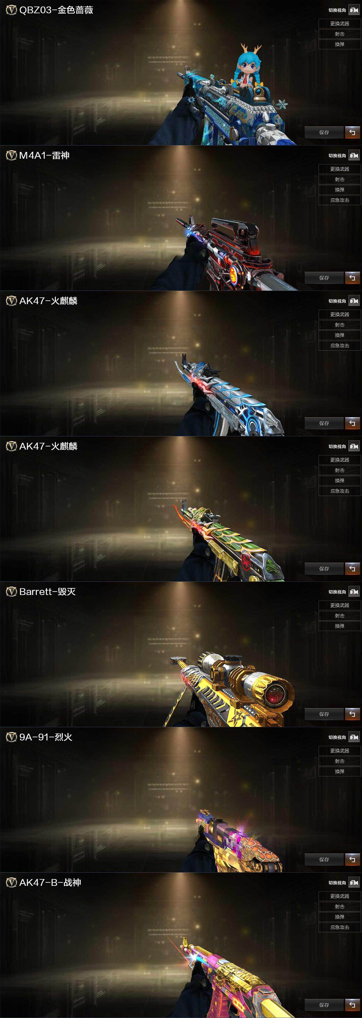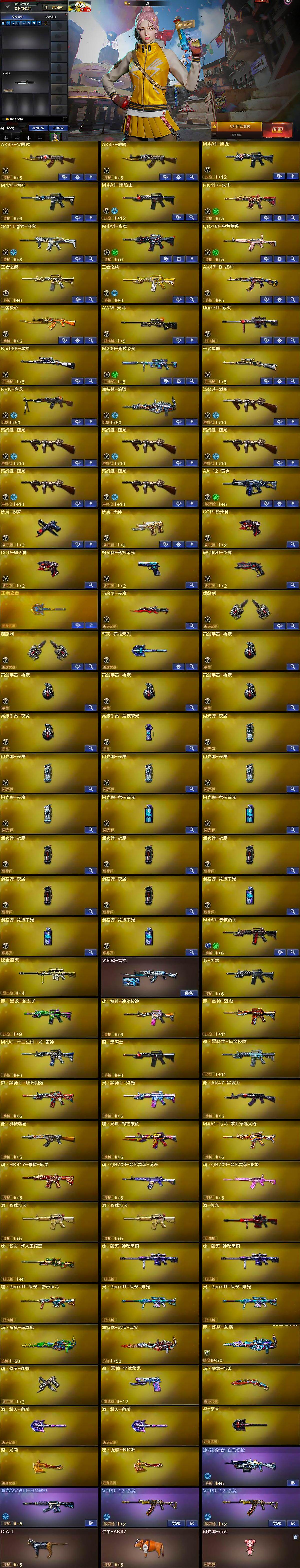 【热门武器】:QBZ03-金色蔷薇,Scar Light-白虎,HK417-朱雀,M200-竞技荣光,Kar98K-星神,C.A.T,牛牛-AK47,M4A1-黑骑士,汤姆逊-烈龙*6,RPK-盘龙,加特林-炼狱,COP-堕天神*2,沙鹰-修罗