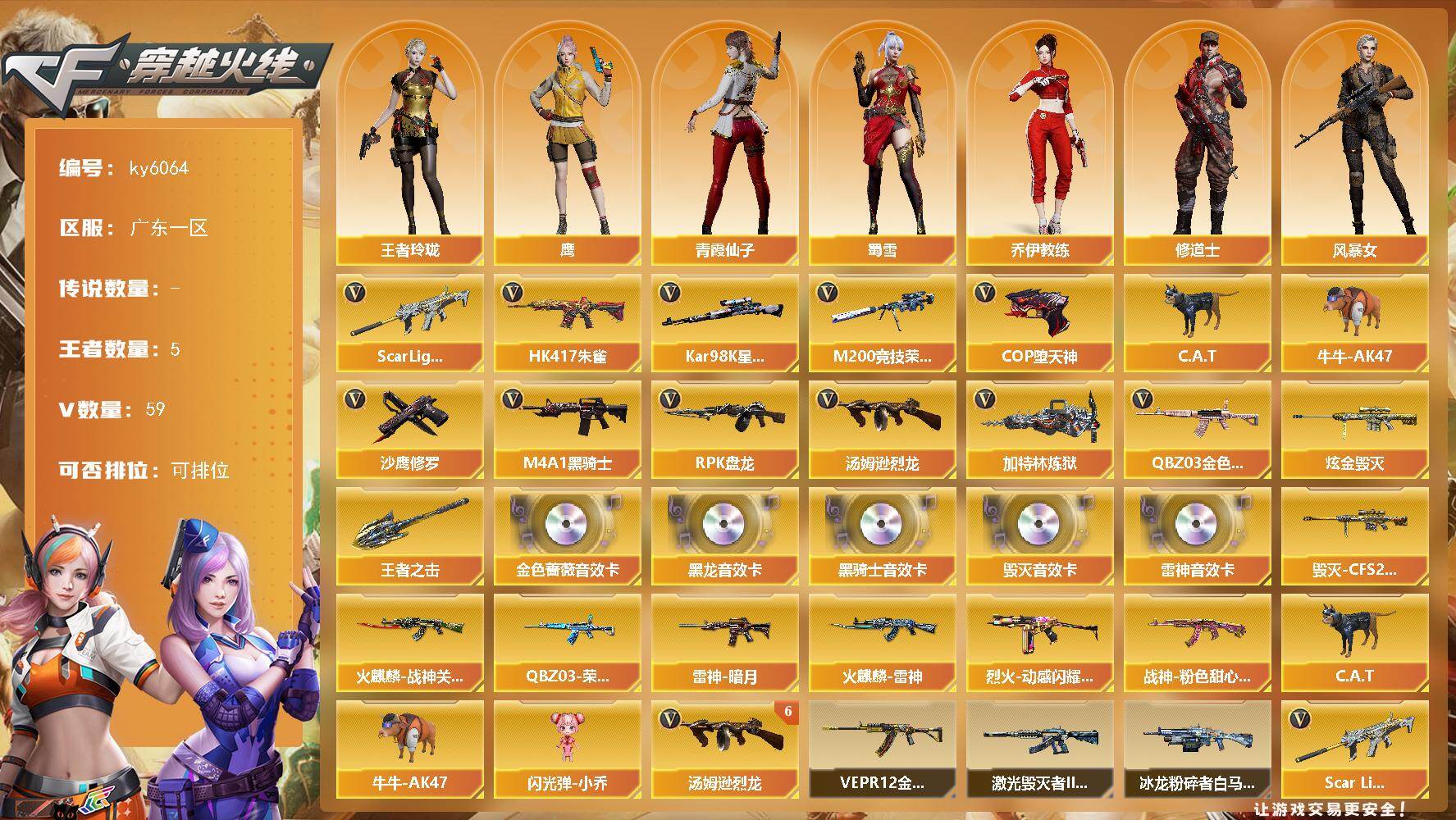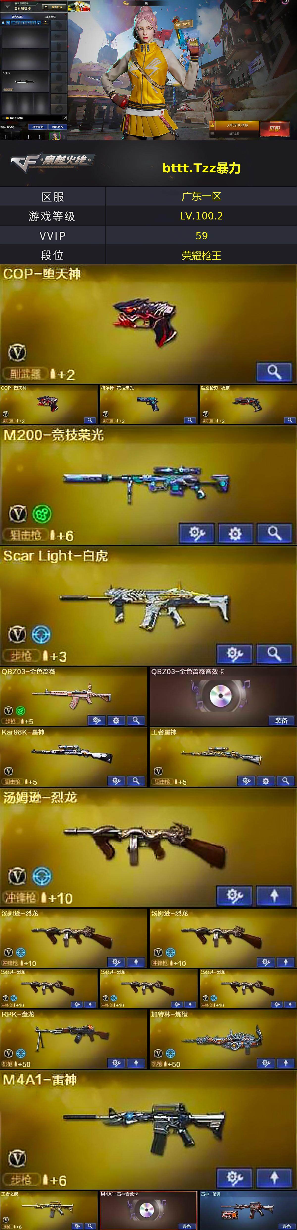 [17326126]广东一区-63V-5王者武器数-1炫金武器数 【热门武器】:QBZ03-金色蔷薇,Scar Light-白虎,HK417-朱雀,M200-竞技荣光,Kar98K-星神,C.A.T,牛牛-AK47,M4A1-黑骑士,汤姆逊-烈龙*6,RPK-盘龙,加特林-炼狱,COP-堕天神*2,沙鹰-修罗 【王者炫金武器】:王者之击,炫金毁灭 【音效卡】:M4A1-雷神音效卡,M4A1-黑龙音效卡,M4A1-黑骑士音效卡,Barrett-毁灭音效卡,QBZ03-金色蔷薇音效卡 【皮肤】:QBZ03-荣耀世冠EP 皮肤,雷神-暗月,火麒麟-雷神,火麒麟-战神关羽,毁灭-CFS2020,烈火-动感闪耀 皮肤,战神-粉色甜心皮肤 【角色】:鹰,王者玲珑,乔伊教练,修道士,风暴女,娟娟,潘多拉-甜心教官,潜龙队-X,青霞仙子,蜀雪,五号兵器-赛博朋克,雪莉杨,影武者-X 【人偶武器】:C.A.T,牛牛-AK47,闪光弹-小乔 【挑战大师】:冰龙粉碎者-白马银枪,激光毁灭者III-白马银枪,VEPR-12-金魔*2 【英雄级武器】:AK47-火麒麟,AK47-麒麟,M4A1-黑龙,M4A1-雷神,M4A1-黑骑士,HK417-朱雀,Scar Light-白虎,M4A1-夜魔,QBZ03-金色蔷薇,9A91-烈火,王者之魄-觉醒版,王者之势-觉醒版,AK47-B-战神,王者炎心-觉醒版,AWM-天龙,Barrett-毁灭,Kar98K-星神,M200-竞技荣光,王者星神-觉醒版,RPK-盘龙,加特林-炼狱,汤姆逊-烈龙*6,AA-12-雷霆,沙鹰-修罗,沙鹰-天神,COP-堕天神*2,柯尔特-竞技荣光,破空枪刃-夜魔,马来剑-夜魔,麒麟刺*2,擎天-竞技荣光,高爆手雷-夜魔*5,高爆手雷-竞技荣光,闪光弹-夜魔*5,闪光弹-竞技荣光*2,烟雾弹-夜魔*5,烟雾弹-竞技荣光*3,烟雾弹-荣耀世冠EP,M4A1-赤狱骑士 【道具】:云山科技背包,冰冰企鹅背包-猛男专用,战舰背包,炫彩背包,超级背包,女皇终结者-魔龙之吻,救世主-黑桃战神,绿色巨人,灵魂忍者,迷雾幽灵,生化弹匣,夺命之镰,防化服*3,流光-再燃火线,枪王排位29赛季金色流光,EP战队击杀图标,C4-红龙,防弹头盔*4,防弹衣*3,C4工具钳*3,手雷包*3 【特殊枪械】:1白虎,1黑骑士,6烈龙,1盘龙,1炼狱