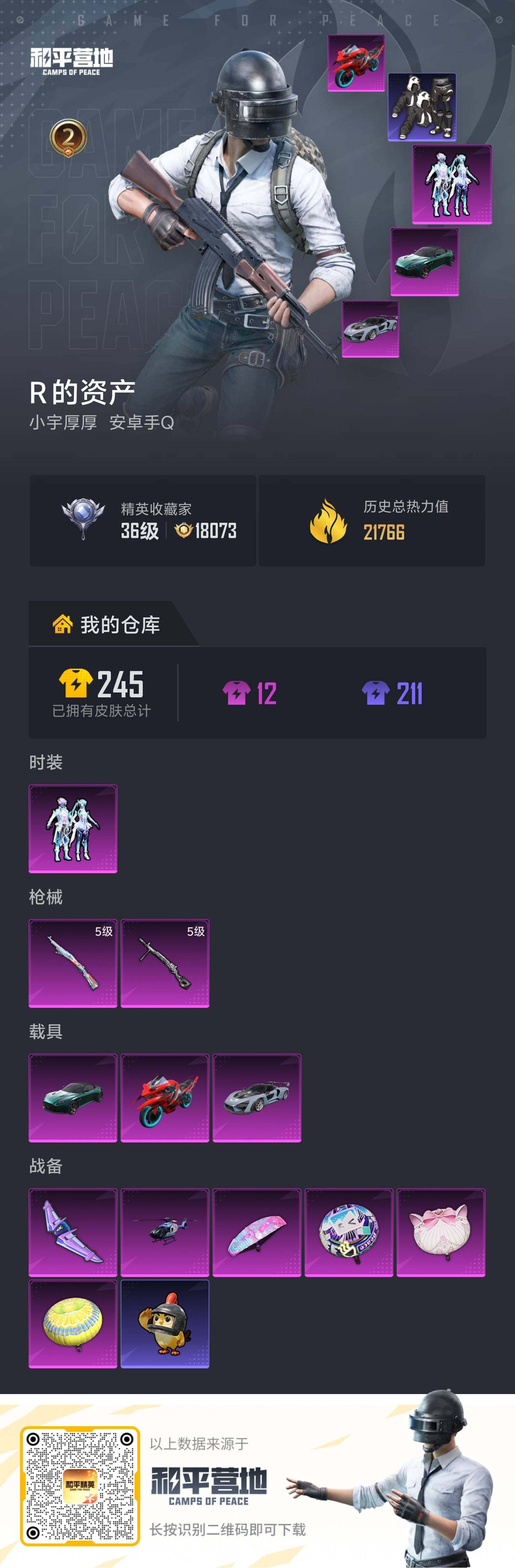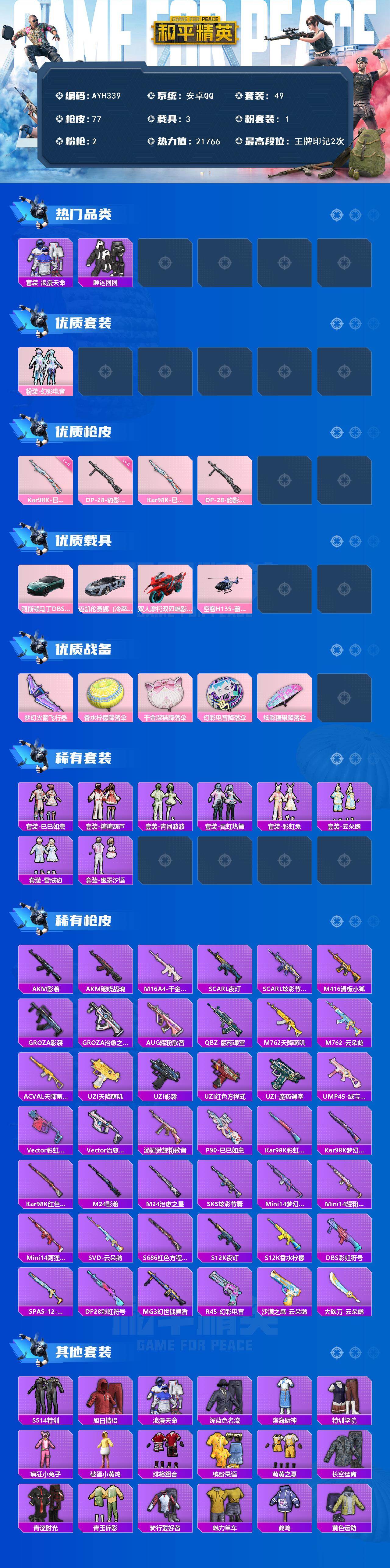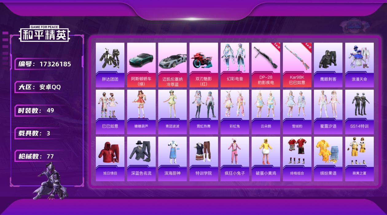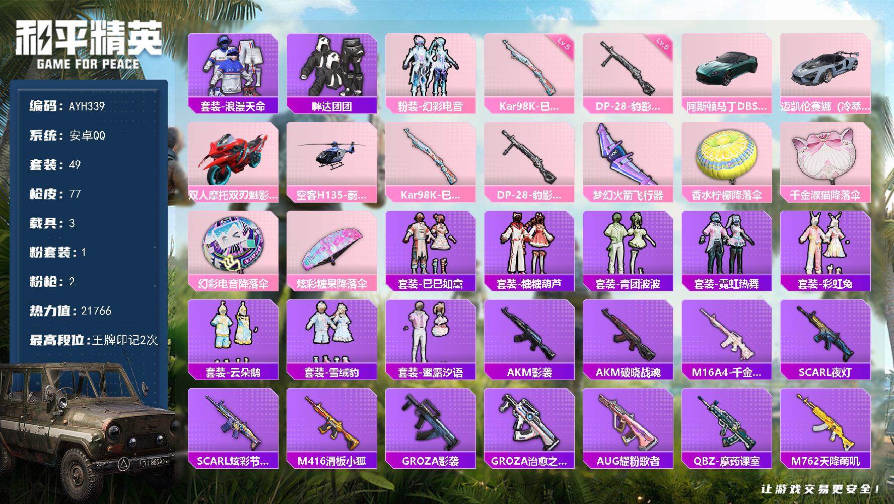 [17326185]【店主推荐捡漏号】安卓 手Q-1粉装-2特效枪-3载具-1粉色飞行器-21766热力值-2王牌印记-49套装-77枪皮【热门品类】:套装-浪漫天命,套装-胖达团团【粉色套装】:粉装-幻彩电音【粉色枪皮等级】:Kar98K-巳巳如意(五级),DP-28-豹影疾电(五级)【粉色载具】:阿斯顿马丁DBS(绿),迈凯伦塞纳(冷萃蓝),双人摩托-双刃魅影(红),空客H135-蔚蓝之翼【粉色枪皮】:Kar98K-巳巳如意,DP-28-豹影疾电
