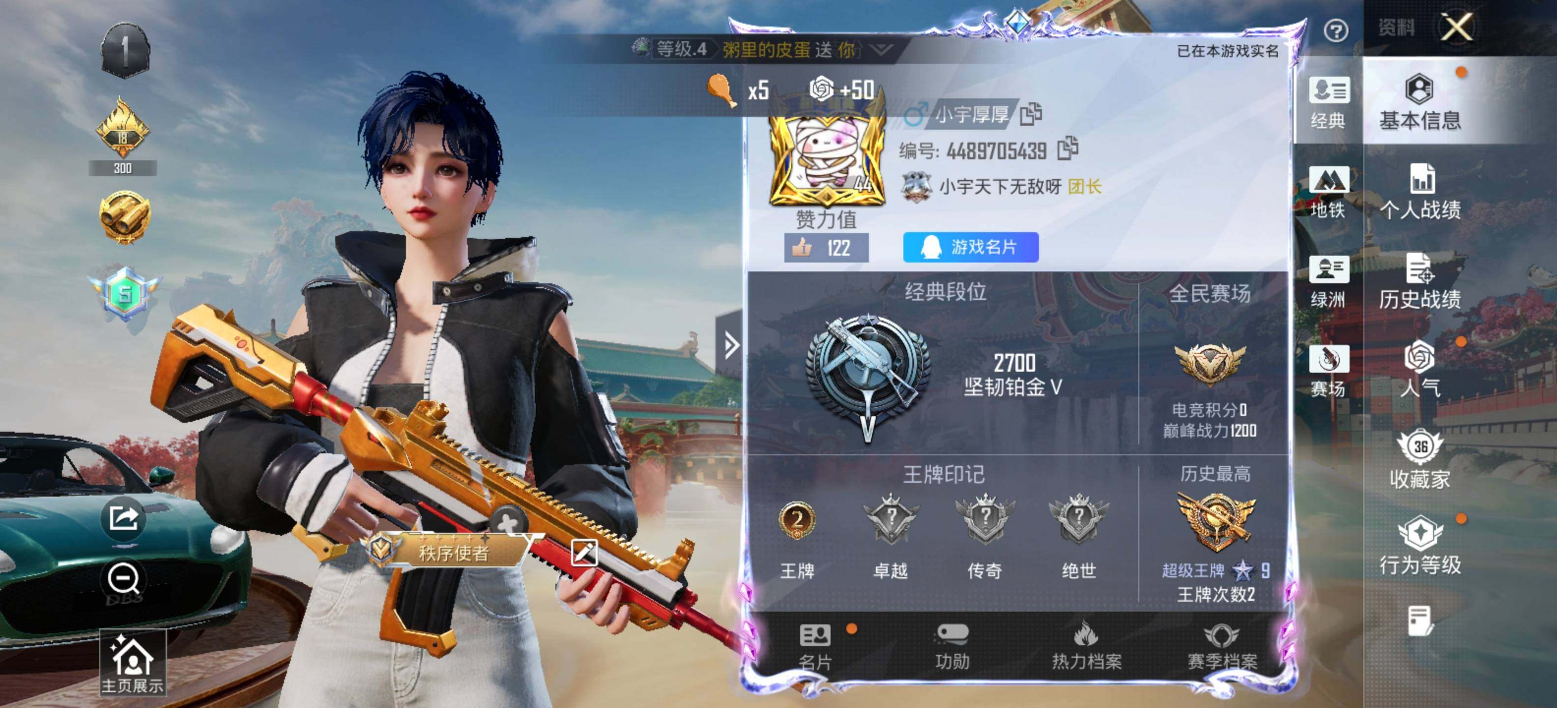 - [36997]英雄数: 86 皮肤数: 2 勇者皮肤数: 46 史诗皮肤数: 10 传说皮肤数: 1 稀有英雄: 艾琳,娜可露露,不知火舞,桑启,戈娅 当前段位: 星耀 限定皮肤: 高山流水,五谷丰年 内测皮肤: 女武神 史诗皮肤: 逐浪之夏,水果甜心,乘风破浪,水晶猎龙者 赛季/战令皮肤: 朔风刀,混沌棋,疑决卦,醍醐杖,原初探秘者,万华元夜,演武夺筹,驱傩正仪,千军破阵,星际陆战队(达摩),金庭之子,大漠名商,云中旅人,海盐诗旅 实名: 无人脸修改机会/实名是本人 普通皮肤: 五福同心,龙腾万里,归虚梦演(鲁班大师),归虚梦演(曜),掌控之力,守护之力,化身博士,缤纷绘卷,黄金武士,天使之翼,红桃皇后,星际陆战队(程咬金),阴阳师,汉昭烈帝,兔女郎,死亡骑士,救世之瞳,白色死神,野性能量,冰雪圆舞曲,露花倒影,花见巫女,未来旅行,龙域领主,蔷薇王座,万圣前夜,异域舞娘,潮流仙人,东海龙王,战争女神,精灵王,加勒比小姐,死神来了,赤焰之缨,启蛰,棒球奇才,海之征途,精准探案法,花间舞,绝影神枪,阿摩司公爵,特种部队,隐刃,木偶奇遇记,海军大将,一千零一夜,英喵野望,前尘,碧珀绯影
