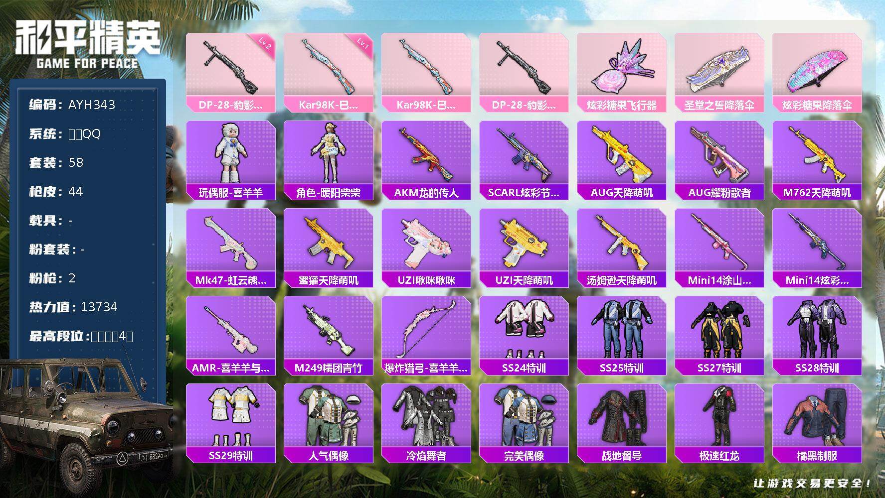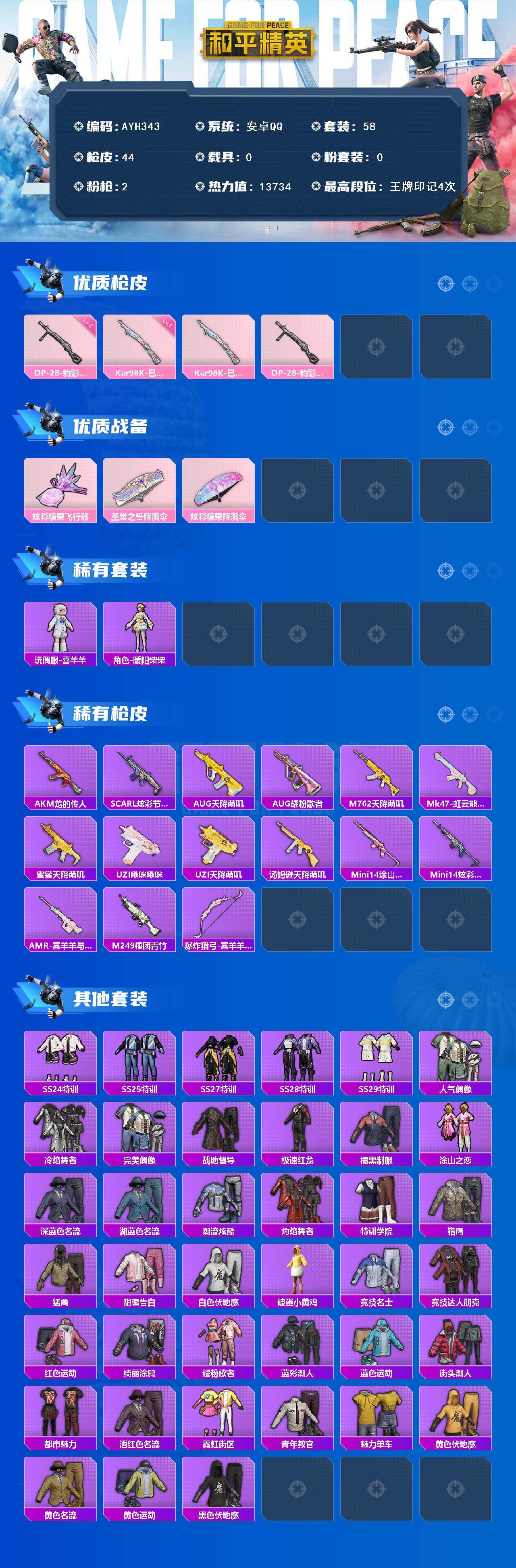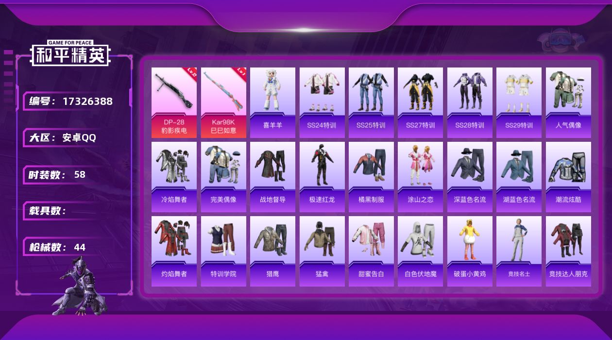 [17326388]【店主推荐捡漏号】安卓 手Q-0粉装-2特效枪-0载具-1粉色飞行器-13734热力值-4王牌印记-58套装-44枪皮【粉色枪皮等级】:Kar98K-巳巳如意(一级),DP-28-豹影疾电(二级)【粉色枪皮】:Kar98K-巳巳如意,DP-28-豹影疾电