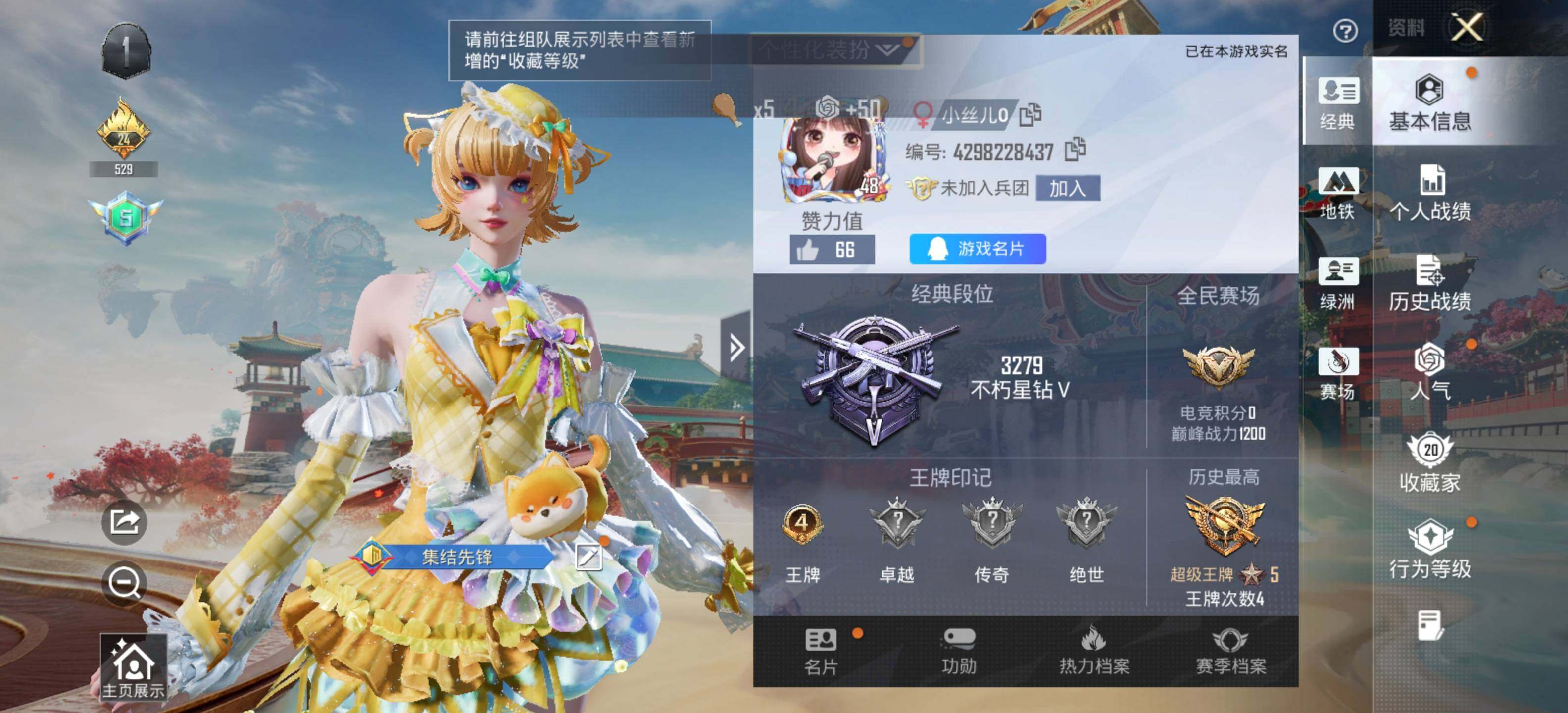 - PX_2057213-贵族等级: V5 英雄数: 47 皮肤数: 30 传说皮: 超时空战士-狄仁杰,云诺千山 限定皮: 鸣野蒿,愿照·山河定