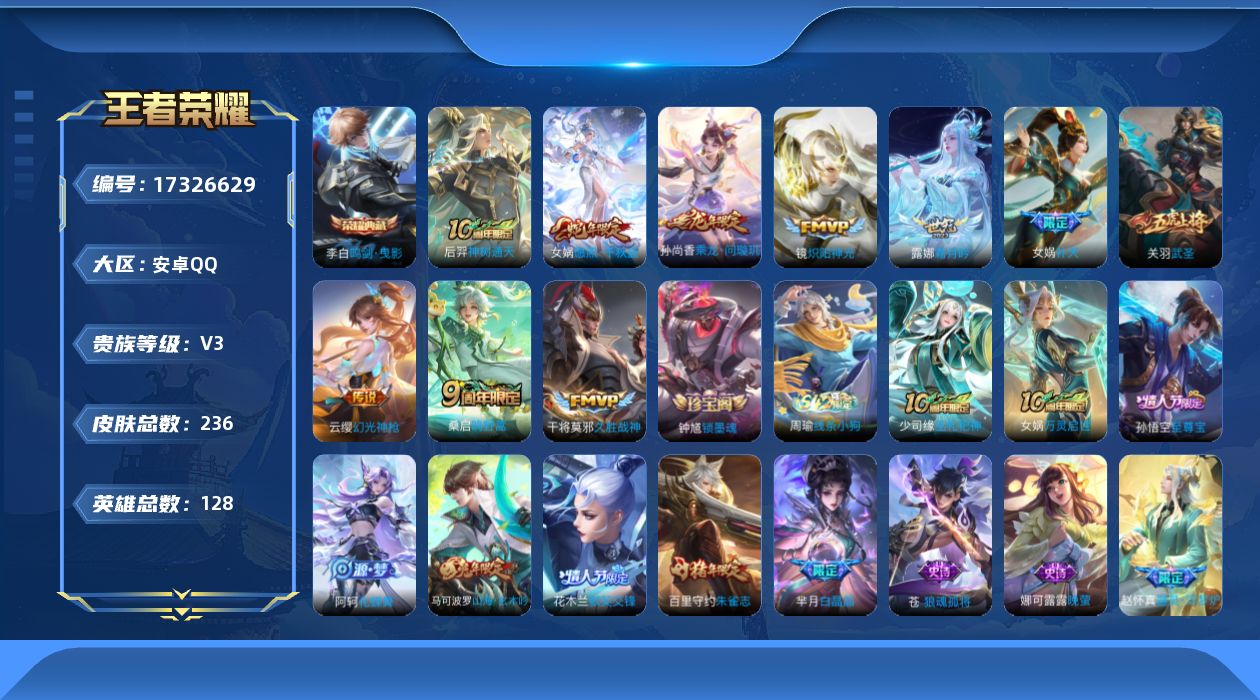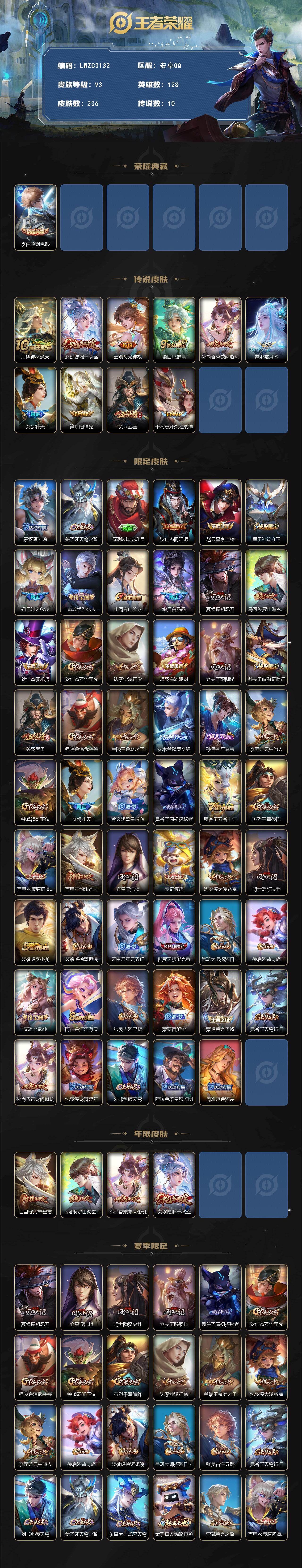 [17326629]【特价急出/详情看图】安卓Q-V3-永恒钻石IV段位-128英雄-236皮肤-1典藏皮肤-10传说-68史诗