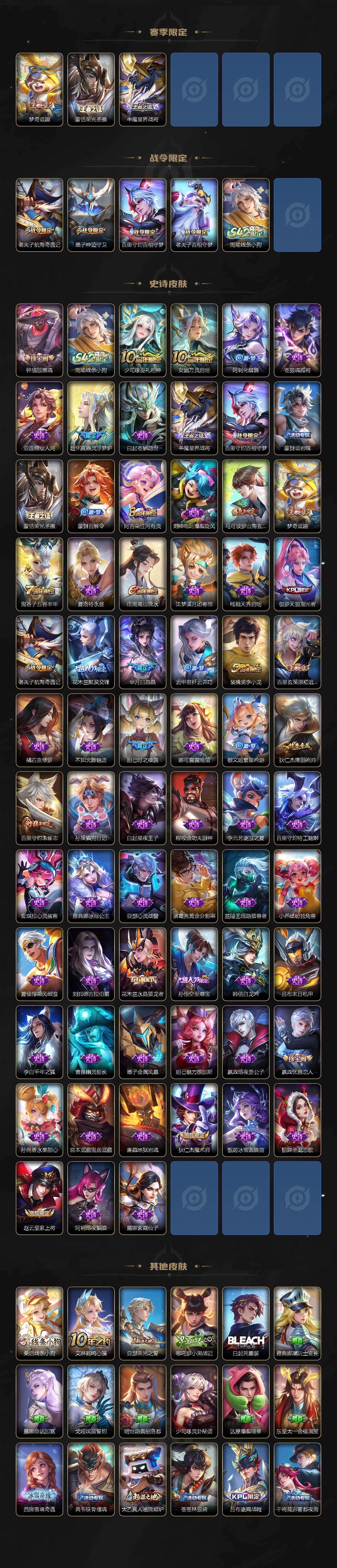 【赛季限定】:夏侯惇朔风刀,弈星混沌棋,明世隐疑决卦,老夫子醍醐杖,鬼谷子原初探秘者,狄仁杰万华元夜,程咬金演武夺筹,钟馗驱傩正仪,苏烈千军破阵,达摩沙漠行僧,兰陵王金庭之子,沈梦溪大漠名商,李元芳云中旅人,桑启海盐诗旅,裴擒虎擒涛扼浪,鲁班大师探海日志,张良古海寻踪,鬼谷子天穹祈灯,刘邦剑破天穹,姜子牙天穹之誓,东皇太一噬灭天穹,太乙真人谧流熔炉,亚瑟荣光之誓,百里玄策原初追逐者,梦奇顽趣,蒙恬荣光圣徽,牛魔星界战将