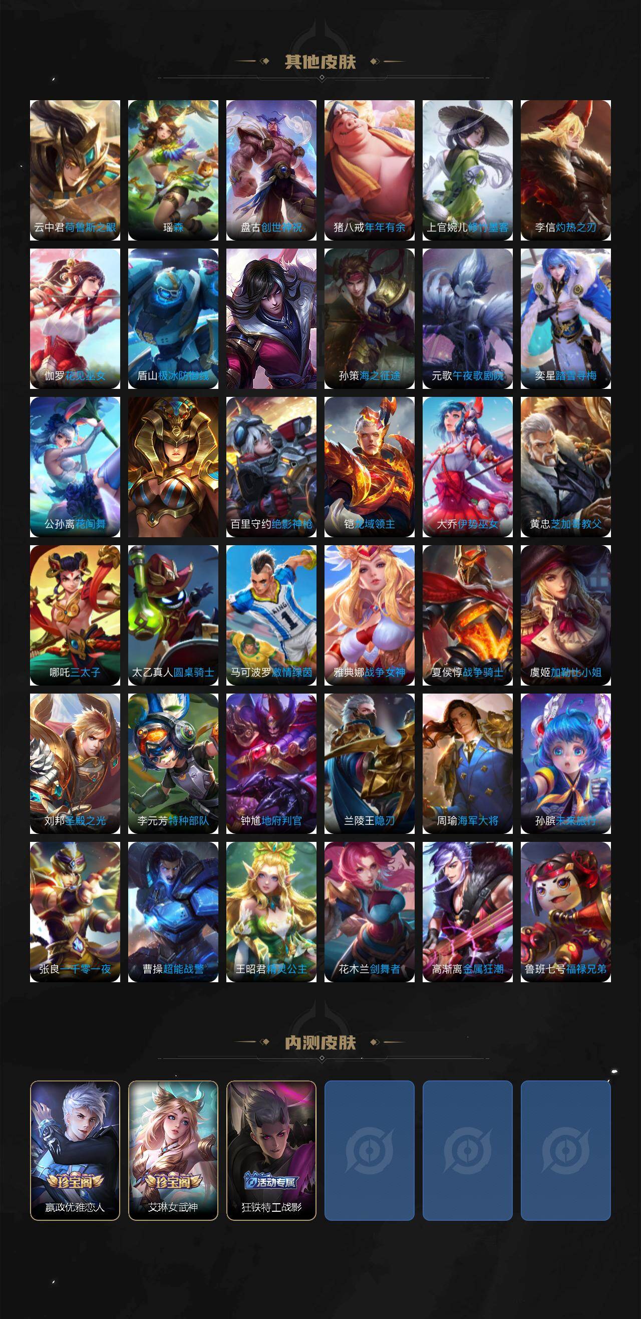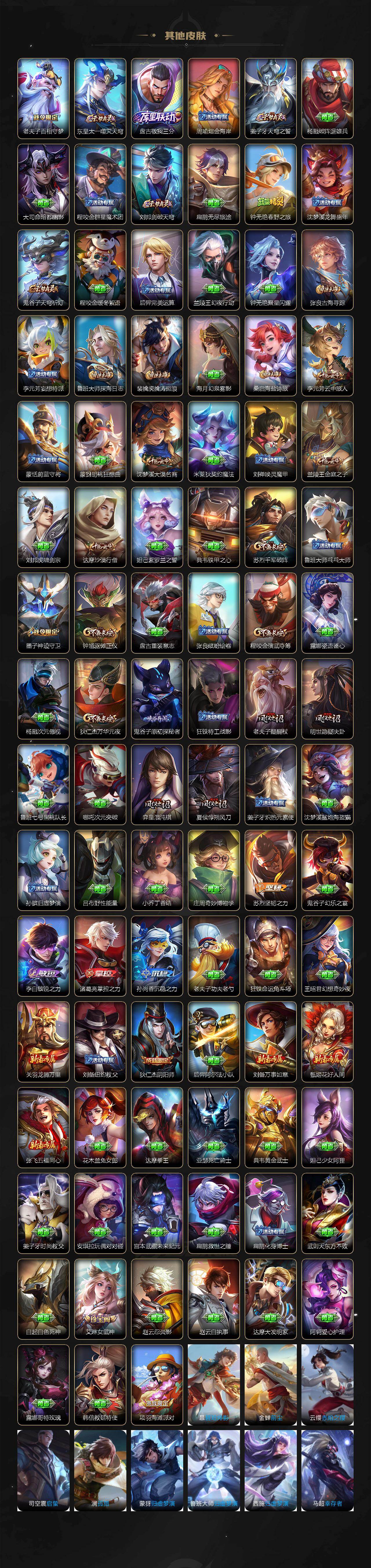 【限定皮肤】:蒙犽顽岩魄,姜子牙天穹之誓,杨戬破阵退雄兵,狄仁杰阴阳师,赵云皇家上将,墨子神迹守卫,妲己时之彼端,嬴政优雅恋人,庄周高山流水,芈月白晶晶,夏侯惇朔风刀,马可波罗山海玄木吟,狄仁杰魔术师,狄仁杰万华元夜,达摩沙漠行僧,项羽海滩派对,老夫子醍醐杖,老夫子航海奇遇记,关羽武圣,程咬金演武夺筹,兰陵王金庭之子,花木兰默契交锋,孙悟空至尊宝,李元芳云中旅人,钟馗驱傩正仪,女娲补天,蔡文姬繁星吟游,鬼谷子原初探秘者,鬼谷子五谷丰年,苏烈千军破阵,百里玄策原初追逐者,百里守约朱雀志,弈星混沌棋,梦奇顽趣,沈梦溪大漠名商,明世隐疑决卦,裴擒虎李小龙,裴擒虎擒涛扼浪,云中君纤云弄巧,伽罗天狼溯光者,鲁班大师探海日志,桑启海盐诗旅,艾琳女武神,阿古朵江河有灵,张良古海寻踪,蒙犽百解令,蒙恬荣光圣徽,鬼谷子天穹祈灯,孙尚香乘龙问璇玑,沈梦溪龙舞盛年,刘邦剑破天穹,程咬金群星魔术团,周瑜熔金海岸