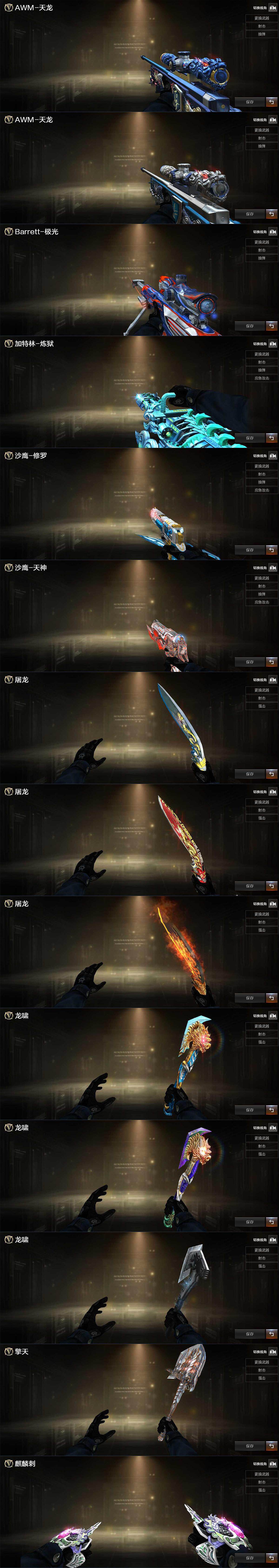 【皮肤】:幻神-降龙,幻神-动感闪耀 皮肤,幻神-星火小队签名臻藏版 皮肤,幻神-AG-CFPL S24冠军 皮肤,白虎-AG-CFPLS20冠军,QBZ03-AG-CFPLS19冠军,AWM-裁决-凤灵皮肤,雷神-暗月,雷神-能量核心,雷神-荣耀之魄,雷神-星空,雷神-R.LGD-CFPLS18冠军,雷神-机甲刑天皮肤,雷神-炽焰魔龙,雷神-动感闪耀 皮肤,雷神-高能霹雳 皮肤,火麒麟-华夏之心,火麒麟-百城,火麒麟-巅峰荣耀,火麒麟-心动糖果,毁灭-暗月*2,毁灭-荣耀之怒,毁灭耀金皮肤*2,毁灭-冠军之怒,毁灭-风暴,毁灭-神秘黑洞皮肤,黑龙-能量核心*2,黑龙-暗月,黑骑士-暗月,黑骑士-战神马超,黑骑士-破浪10年皮肤,黑骑士-破界 皮肤,死神-秘银,天启-暗月*2,烈火-动感闪耀 皮肤*2,战神-紫绶金章皮肤,战神-流金岁月皮肤,AK47-B-常胜将军-曹操*2,AK47-B-常胜将军-刘备,AK47-B-常胜将军-孙权,天龙-秘银,AWM-天龙-传奇70KG*2,AWM-天龙-传奇白鲨,极光-能量核心,炼狱-夏佐 皮肤,修罗-冠军之魂,天神-暗月*2,屠龙-荣耀之锋,屠龙-荣耀世冠AG*2,屠龙-星火燎原,屠龙-春桃 皮肤,龙啸-冠军之啸,龙啸-巅峰荣耀 皮肤*2,轻型军用手斧-再燃火线,擎天-秘银,麒麟刺-萌杀皮肤