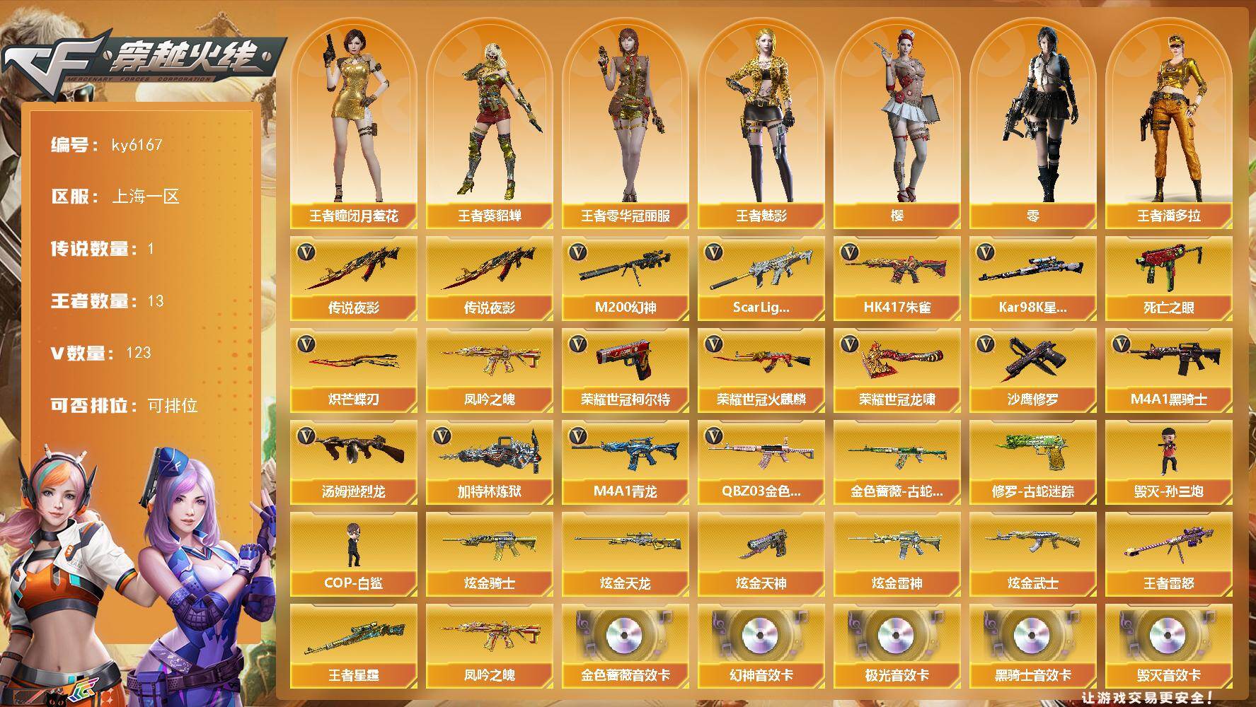 [17326672]上海一区-125V-13王者武器数-6炫金武器数 【传说武器】:传说夜影 【热门武器】:传说夜影,QBZ03-金色蔷薇,Scar Light-白虎,HK417-朱雀,M4A1-青龙,M200-幻神,金色蔷薇-古蛇迷踪,修罗-古蛇迷踪,死亡之眼,凤吟之魄,荣耀世冠-火麒麟,荣耀世冠-柯尔特,Kar98K-星神,M4A1-黑骑士*2,汤姆逊-烈龙*5,加特林-炼狱,毁灭-孙三炮,COP-白鲨*2,沙鹰-修罗*4,炽芒蝶刃,荣耀世冠-龙啸 【王者炫金武器】:凤吟之魄,王者雷怒,王者星霆,炫金骑士,炫金雷神,炫金武士,炫金天龙*2,炫金天神 【音效卡】:屠龙-动感闪耀 音效卡,天神-动感闪耀 音效卡,烈火-动感闪耀 音效卡,QBZ03-金色蔷薇-热带奇洋音效卡*2,M200-幻神音效卡,AK47-火麒麟音效卡,M4A1-黑骑士音效卡,Barrett-毁灭音效卡,Barrett-极光音效卡,QBZ03-金色蔷薇音效卡,死神-雪域霜狐-怀旧音效卡 【皮肤】:幻神-降龙,幻神-动感闪耀 皮肤,幻神-星火小队签名臻藏版 皮肤,幻神-AG-CFPL S24冠军 皮肤,白虎-AG-CFPLS20冠军,QBZ03-AG-CFPLS19冠军,AWM-裁决-凤灵皮肤,雷神-暗月,雷神-能量核心,雷神-荣耀之魄,雷神-星空,雷神-R.LGD-CFPLS18冠军,雷神-机甲刑天皮肤,雷神-炽焰魔龙,雷神-动感闪耀 皮肤,雷神-高能霹雳 皮肤,火麒麟-华夏之心,火麒麟-百城,火麒麟-巅峰荣耀,火麒麟-心动糖果,毁灭-暗月*2,毁灭-荣耀之怒,毁灭耀金皮肤*2,毁灭-冠军之怒,毁灭-风暴,毁灭-神秘黑洞皮肤,黑龙-能量核心*2,黑龙-暗月,黑骑士-暗月,黑骑士-战神马超,黑骑士-破浪10年皮肤,黑骑士-破界 皮肤,死神-秘银,天启-暗月*2,烈火-动感闪耀 皮肤*2,战神-紫绶金章皮肤,战神-流金岁月皮肤,AK47-B-常胜将军-曹操*2,AK47-B-常胜将军-刘备,AK47-B-常胜将军-孙权,天龙-秘银,AWM-天龙-传奇70KG*2,AWM-天龙-传奇白鲨,极光-能量核心,炼狱-夏佐 皮肤,修罗-冠军之魂,天神-暗月*2,屠龙-荣耀之锋,屠龙-荣耀世冠AG*2,屠龙-星火燎原,屠龙-春桃 皮肤,龙啸-冠军之啸,龙啸-巅峰荣耀 皮肤*2,轻型军用手斧-再燃火线,擎天-秘银,麒麟刺-萌杀皮肤