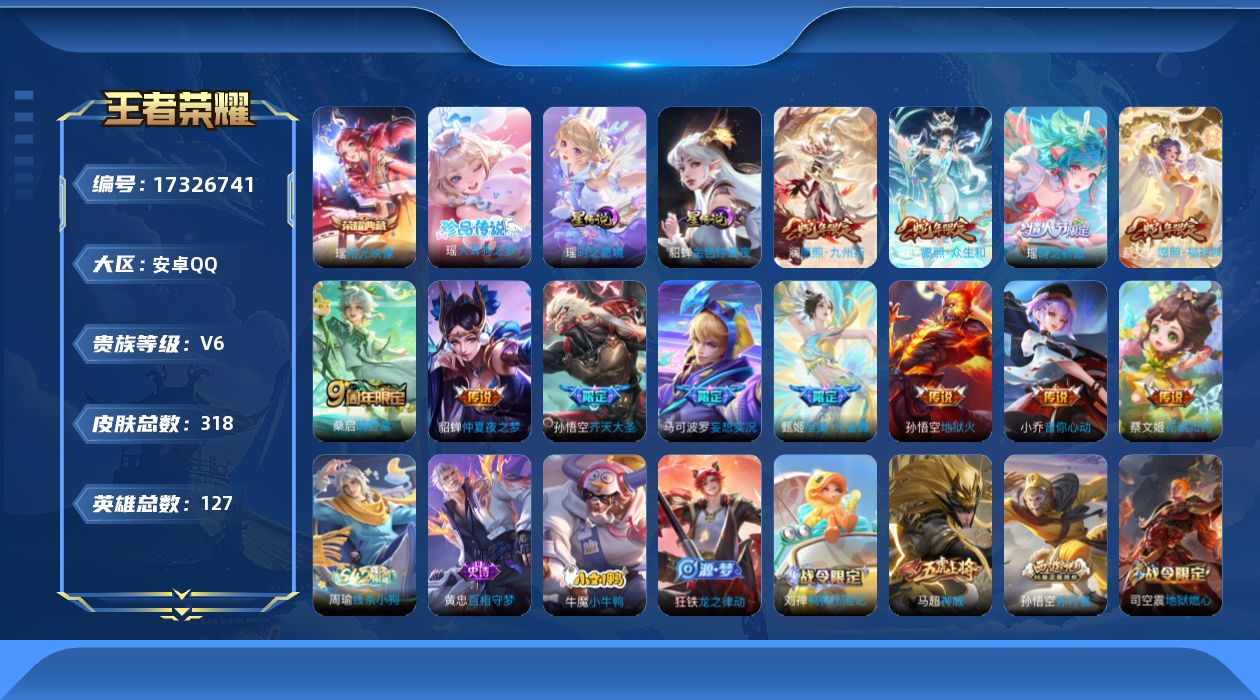- [16183305]安卓Q-V6-127英雄-360皮肤-4典藏皮肤-1典藏英雄-17传说-107史诗 【英雄全皮】:猪八戒全皮,戈娅全皮,影全皮 【荣耀典藏】:武则天英雄,夏侯惇无限飓风号,小乔天鹅之梦,李白鸣剑曳影,关羽赤影疾锋 【传说皮肤】:桑启鸣野蒿,赵云淬星耀世,诸葛亮时雨天司,镜炽阳神光,虞姬启明星使,孙悟空零号赤焰,关羽武圣,曜云鹰飞将,李信一念神魔,貂蝉猫影幻舞,干将莫邪久胜战神,达摩黄金狮子座,花木兰冠军飞将,李白凤求凰,孙尚香末日机甲,宫本武藏地狱之眼,武则天海洋之心 【限定皮肤】:白起狰,姜子牙天穹之誓,狄仁杰阴阳师,虞姬凯尔特女王,赵云皇家上将,墨子神迹守卫,嬴政优雅恋人,嬴政白昼王子,鲁班七号狮舞东方,庄周高山流水,高渐离死亡摇滚,高渐离玩趣恶龙,阿轲迷踪丽影,钟无艳超时空战士,扁鹊炼金王,扁鹊奇幻香踪,白起夜都怪侠,芈月重明,芈月幻夜卜梦,吕布猎兽之王,吕布御风骁将,周瑜赤莲之焰,元歌云间偶戏,夏侯惇朔风刀,甄姬游园惊梦,甄姬落雪兰心,曹操烛龙,典韦穷奇,典韦蓝屏警告,马可波罗暗影游猎,狄仁杰魔术师,狄仁杰万华元夜,达摩星际陆战队,达摩沙漠行僧,项羽海滩派对,老夫子醍醐杖,老夫子航海奇遇记,关羽冰锋战神,关羽武圣,程咬金演武夺筹,刘邦夺宝奇兵,韩信逐梦之影,王昭君午后时光,兰陵王驯魔猎人,兰陵王金庭之子,花木兰默契交锋,亚瑟潮玩骑士王,孙悟空大圣娶亲,孙悟空零号赤焰,牛魔御旌,后羿圣弓游侠,李元芳银河之约,李元芳云中旅人,虞姬启明星使,钟馗神迹守卫,钟馗驱傩正仪,杨戬潮玩骑兵,女娲朔望之晖,干将莫邪冰霜恋舞曲,干将莫邪真爱魔法,雅典娜单词大作战,雅典娜黎明之约,蔡文姬繁星吟游,太乙真人饕餮,鬼谷子原初探秘者,鬼谷子五谷丰年,诸葛亮时雨天司,黄忠火炮绅士,铠青龙志,苏烈千军破阵,百里玄策原初追逐者,弈星混沌棋,梦奇顽趣,沈梦溪星空之诺,沈梦溪大漠名商,明世隐疑决卦,明世隐吟游魔法,裴擒虎李小龙,裴擒虎擒涛扼浪,狂铁御狮,狂铁电玩高手,米莱狄御霄,米莱狄胡桃异想国,云中君纤云弄巧,盾山御銮,猪八戒西部大镖客,猪八戒猪悟能,上官婉儿梁祝,嫦娥暖冬兔眠,西施玲珑珍味,蒙犽狂想玩偶喵,鲁班大师探海日志,桑启海盐诗旅,暃星界游侠,戈娅驭风魔法,艾琳流音漫舞,赵怀真鹤归松栖,司空震地狱燃心,阿古朵江河有灵,张良古海寻踪,蒙恬荣光圣徽,鬼谷子天穹祈灯,姬小满妄想食味,沈梦