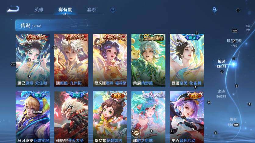 【传说皮肤】:妲己愿照众生和,澜愿照九州拓,蔡文姬愿照福禄聚,桑启鸣野蒿,甄姬至美化雀舞,马可波罗妄想实况,孙悟空齐天大圣,蔡文姬花朝如约,瑶时之祈愿,小乔音你心动,貂蝉仲夏夜之梦,孙悟空地狱火