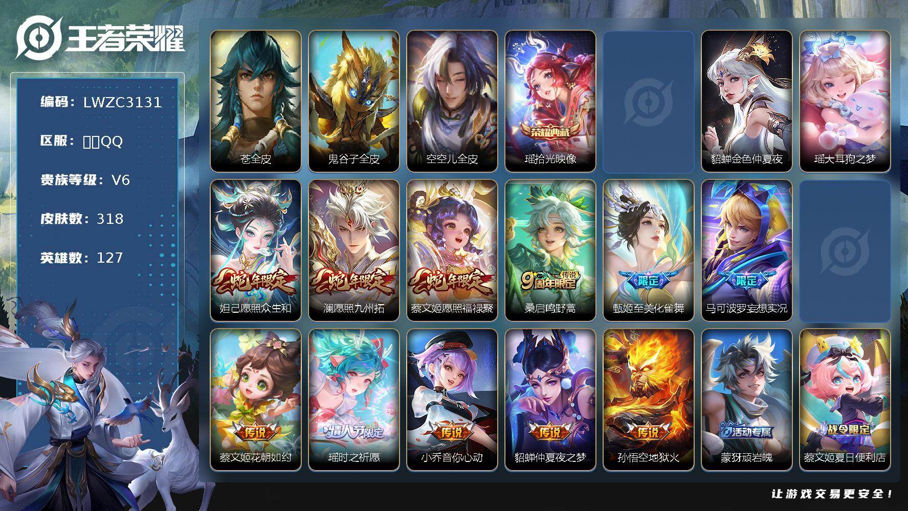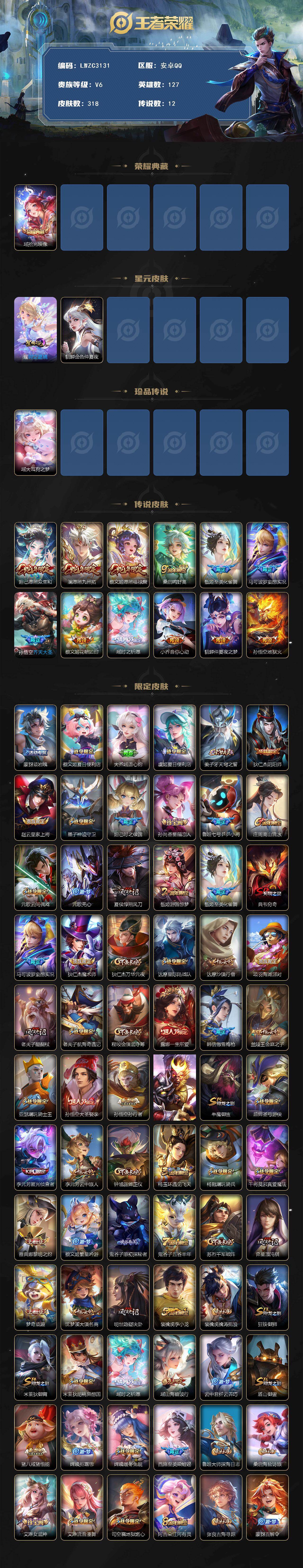 [17326741]可二次【特价出售/店主推荐】安卓Q-V6-至尊星耀III段位-127英雄-318皮肤-1典藏皮肤-1珍品传说-2星传说-12传说-85史诗