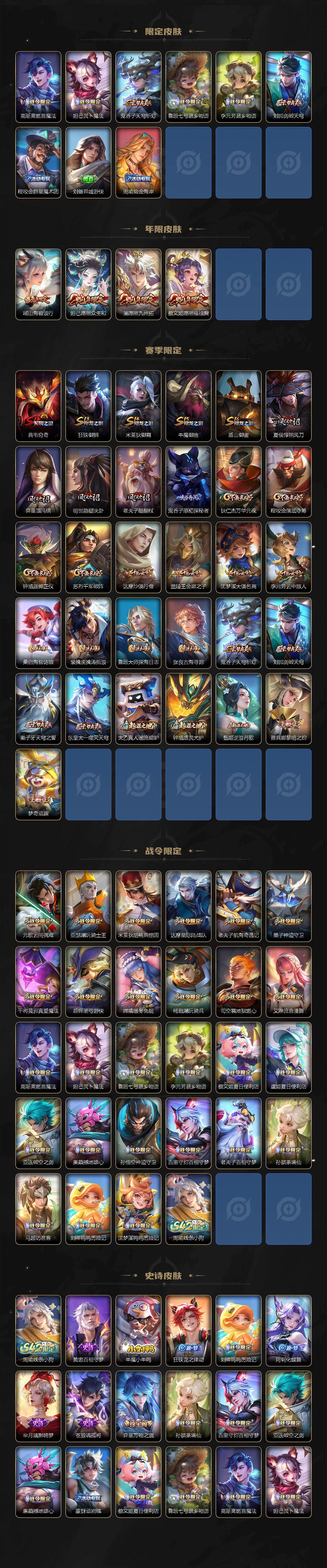 【赛季限定】:典韦穷奇,狂铁御狮,米莱狄御霄,牛魔御旌,盾山御銮,夏侯惇朔风刀,弈星混沌棋,明世隐疑决卦,老夫子醍醐杖,鬼谷子原初探秘者,狄仁杰万华元夜,程咬金演武夺筹,钟馗驱傩正仪,苏烈千军破阵,达摩沙漠行僧,兰陵王金庭之子,沈梦溪大漠名商,李元芳云中旅人,桑启海盐诗旅,裴擒虎擒