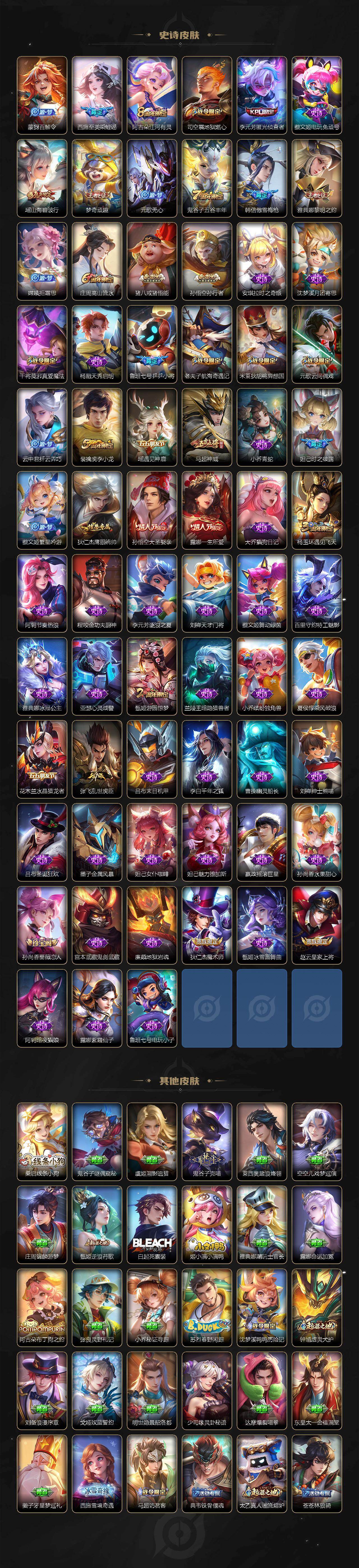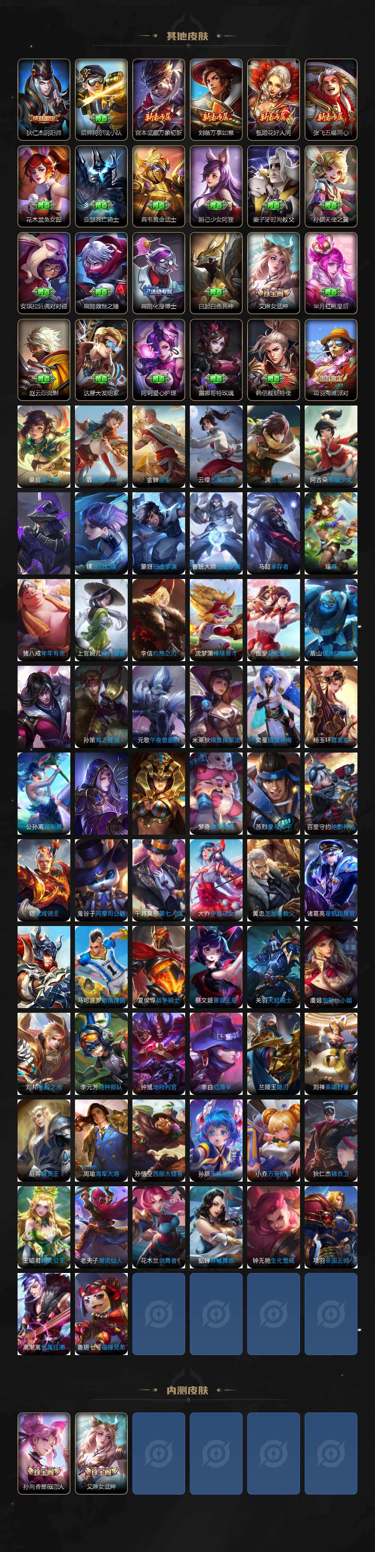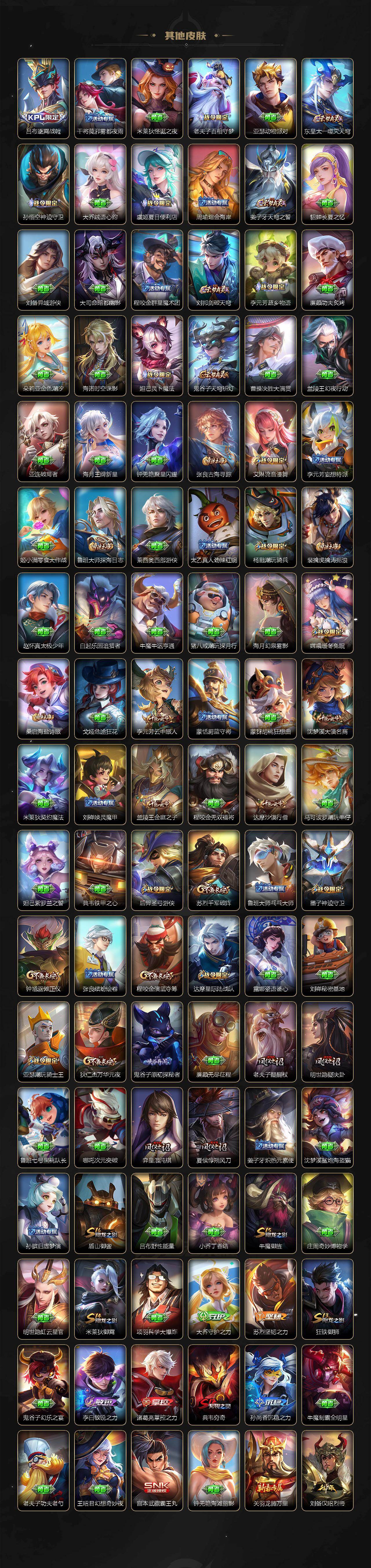 【限定皮肤】:蒙犽顽岩魄,蔡文姬夏日便利店,大乔绒语心约,虞姬夏日便利店,姜子牙天穹之誓,狄仁杰阴阳师,赵云皇家上将,墨子神迹守卫,妲己时之彼端,孙尚香蔷薇恋人,鲁班七号乒乒小将,庄周高山流水,元歌云间偶戏,元歌无心,夏侯惇朔风刀,甄姬游园惊梦,甄姬至美化雀舞,典韦穷奇,马可波罗妄想实况,狄仁杰魔术师,狄仁杰万华元夜,达摩星际陆战队,达摩沙漠行僧,项羽海滩派对,老夫子醍醐杖,老夫子航海奇遇记,程咬金演武夺筹,露娜一生所爱,韩信傲雪梅枪,兰陵王金庭之子,亚瑟潮玩骑士王,孙悟空大圣娶亲,孙悟空孙行者,孙悟空齐天大圣,牛魔御旌,后羿圣弓游侠,李元芳匿光侦查者,李元芳云中旅人,钟馗驱傩正仪,杨玉环遇见飞天,杨戬潮玩骑兵,干将莫邪真爱魔法,雅典娜黎明之约,蔡文姬繁星吟游,鬼谷子原初探秘者,鬼谷子五谷丰年,苏烈千军破阵,弈星混沌棋,梦奇顽趣,沈梦溪大漠名商,明世隐疑决卦,裴擒虎李小龙,裴擒虎擒涛扼浪,狂铁御狮,米莱狄御霄,米莱狄胡桃异想国,瑶时之祈愿,瑶山海碧波行,云中君纤云弄巧,盾山御銮,猪八戒猪悟能,嫦娥拒霜思,嫦娥暖冬兔眠,西施至美乘鲤谣,鲁班大师探海日志,桑启海盐诗旅,艾琳女武神,艾琳流音漫舞,司空震地狱燃心,阿古朵江河有灵,张良古海寻踪,蒙犽百解令,高渐离燃音魔法,妲己灵卜魔法,鬼谷子天穹祈灯,鲁班七号蔬乡物语,李元芳蔬乡物语,刘邦剑破天穹,程咬金群星魔术团,刘备异域游侠,周瑜熔金海岸
