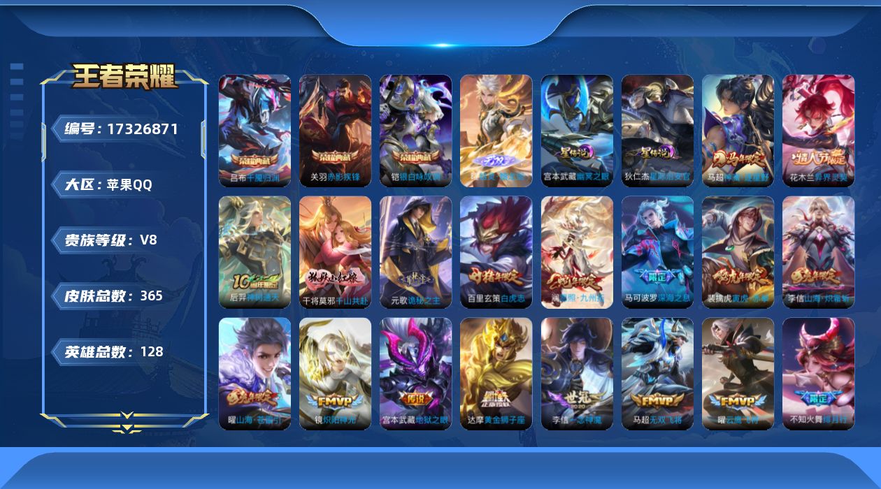 [17326871]【特价急出/详情看图】苹果Q-V8-至尊星耀IV段位-128英雄-352皮肤-2典藏皮肤-1无双-3星元-31传说-109史诗【英雄全皮】:元歌全皮,孙权全皮,李信全皮,鲁班大师全皮,戈娅全【荣耀典藏】:关羽赤影疾锋,铠银白咏叹调【无双皮肤】:曜器灵螭龙剑【传说皮肤】:后羿神树通天,干将莫邪千山共赴,元歌诡秘之主,澜愿照九州拓,云缨幻光神枪,桑启鸣野蒿,马可波罗妄想实况,项羽无限倾心,孙悟空齐天大圣,曜山海苍雷引,李信山海炽霜斩,吕布怒海麟威,李白诗剑行,不知火舞绯月行,马可波罗深海之息,马超无双飞将,孙策挚爱之约,露娜启示之音,孙策末日机甲,裴擒虎寅虎赤拳,鲁班七号寅虎瑞焰,赵云淬星耀世,镜炽阳神光,虞姬启明星使,曜云鹰飞将,李信一念神魔,刘备时之恋人,干将莫邪久胜战神,达摩黄金狮子座,宫本武藏地狱之眼,狄仁杰超时空战士【限定皮肤】:暃埋骨钱,蒙犽顽岩魄,蔡文姬夏日便利店,大乔绒语心约,虞姬夏日便利店,姜子牙天穹之誓,杨戬破阵退雄兵,狄仁杰阴阳师,廉颇寅虎御盾,赵云皇家上将,赵云龙胆,妲己时之奇旅,嬴政优雅恋人,鲁班七号寅虎瑞焰,庄周高山流水,钟无艳超时空战士,扁鹊奇幻香踪,白起夜都怪侠,芈月幻夜卜梦,元歌云间偶戏,元歌无心,甄姬落雪兰心,马可波罗暗影游猎,马可波罗深海之息,马可波罗山海玄木吟,马可波罗妄想实况,狄仁杰魔术师,达摩沙漠行僧,项羽海滩派对,项羽无限倾心,关羽百相守梦,露娜启示之音,刘邦夺宝奇兵,王昭君午后时光,兰陵王金庭之子,花木兰青春决赛季,不知火舞绯月行,孙悟空至尊宝,孙悟空齐天大圣,后羿圣弓游侠,李元芳银河之约,李元芳匿光侦查者,李元芳云中旅人,虞姬启明星使,杨戬潮玩骑兵,干将莫邪真爱魔法,雅典娜黎明之约,鬼谷子五谷丰年,黄忠火炮绅士,铠青龙志,苏烈千军破阵,百里玄策原初追逐者,梦奇顽趣,沈梦溪大漠名商,明世隐吟游魔法,裴擒虎天狼狩猎者,裴擒虎李小龙,裴擒虎寅虎赤拳,裴擒虎擒涛扼浪,狂铁电玩高手,云中君纤云弄巧,李信山海炽霜斩,盾山梦圆繁星,孙策挚爱之约,上官婉儿梁祝,嫦娥拒霜思,嫦娥暖冬兔眠,曜山海苍雷引,西施玲珑珍味,鲁班大师匿光启智者,鲁班大师探海日志,桑启海盐诗旅,暃星界游侠,戈娅驭风魔法,艾琳流音漫舞,司空震地狱燃心,阿古朵江河有灵,张良古海寻踪,蒙犽百解令,蒙恬荣光圣徽,高渐离燃音魔法,妲己灵卜魔法,鬼谷子天穹祈灯,姬小满妄想食味