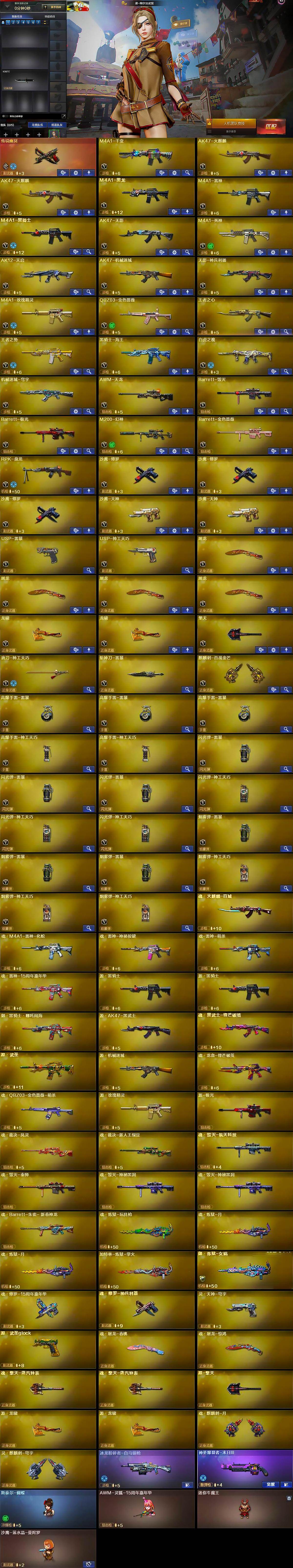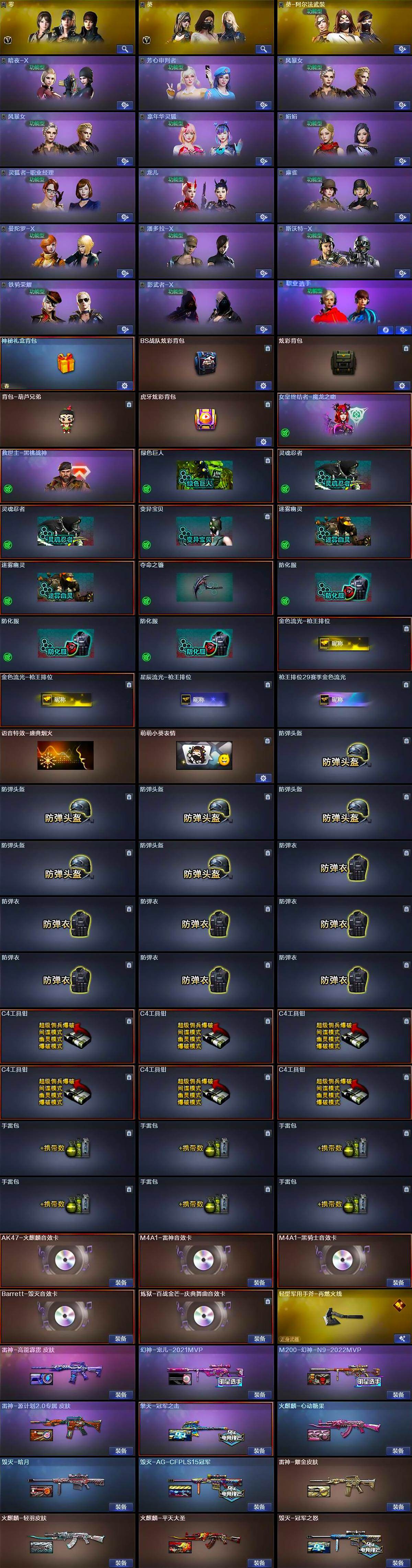 - [11824152]4粉装 7特效枪 2载具 9印记 可二次 可修改实名 女号 身法装备:Mark.06(新蓝螳螂) 优质装备:宝马X6 M(曼岛绿),AKM绿萝繁花,M416电玩时刻,时空协奏·心弦,GROZA-镜光银凌,SVD-月影灵韵,七级SVD-月影灵韵,樱桃泡泡,MK14-甜梦熊击,幻彩电音,Kar98K-巳巳如意 热门装扮:金丰海韵,迅捷狂鲨 稀有枪皮:DP-28-豹影疾电 五级特效枪:五级GROZA-镜光银凌,五级Kar98K-巳巳如意,五级DP-28-豹影疾电,五级MK14-甜梦熊击,五级M416-电玩时刻,五级AKM-绿萝繁花 紫色装扮:SS31特训套装,六六大吉,冷焰舞者,千禧之恋,霓虹热舞,SS30特训套装,云朵鹅,彩虹兔,雪绒豹,SS33特训套装,顶瓜瓜,时希公主,豚鼠丹丹,竞技角斗士,吉莉礼服,SS17特训,酒红色名流,野性山猫,长空猛禽,霓虹街区,青年教官,缤纷果语,蓝色运动,魅力单车,龙的传人,龟仙人,冰河战士,龙魂突击队,蝶变,香桃花海,格斗先锋,暗黑骑手,幻影武者,完美偶像,帅气教官,绮丽涂鸦,生化防暴队,空岛之星,竞技达人朋克,王牌教练,燃烧卡路里,特殊使命,特训学院,小熊娃娃,雏菊兔兔,萝兰蝴蝶,SS29特训,星途旅人,SS28特训,铁血战翼,Mark.06(新蓝螳螂),异域银装,鱼渊荷华,燕燕于飞,巳巳如意,森林游猎者,海琴烟,青团波波,糖糖葫芦,棉花软糖,竞技名士,街头风暴,怀庆长公主,银尘,惊鸿侠骨,SS25特训,锦衣飞扬,SS27特训,华灯初上,SS26特训,晶辉守护,大橘大利,星渊小夜曲,粉恋花,蓝冰羽,紫幽梦,SS32特训服(SS32特训套装),猎影月神,绯格组合,闪电轻猫,糖霜甜心,恋语绒绒,冰冻风暴,旷野奇兵,光之冒险,奇趣企鹅 优质战备:星梦奇缘降落伞,霓虹漫游降落伞,星途旅人降落伞,未来领航者降落伞,莲影清波降落伞,绝色倾城飞行器,蜜语绒猫降落伞,繁龙极客降落伞,幻彩电音降落伞,冷漠罗丽降落伞,飞天猪飞行器,荧海星豚降落伞,智趣喵喵降落伞,鬼刀降落伞,牡丹亭·游园飞行器,智耀战神降落伞,雪月幻音降落伞,桃粉嫣然降落伞,樱桃泡泡降落伞