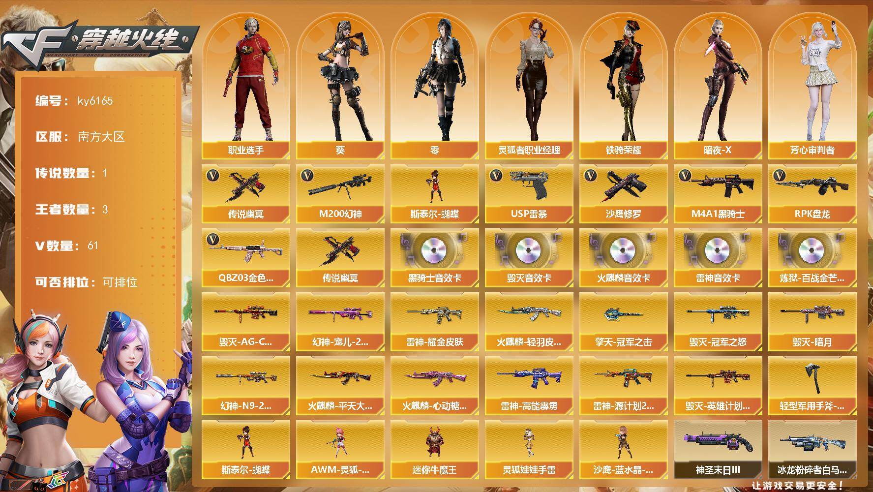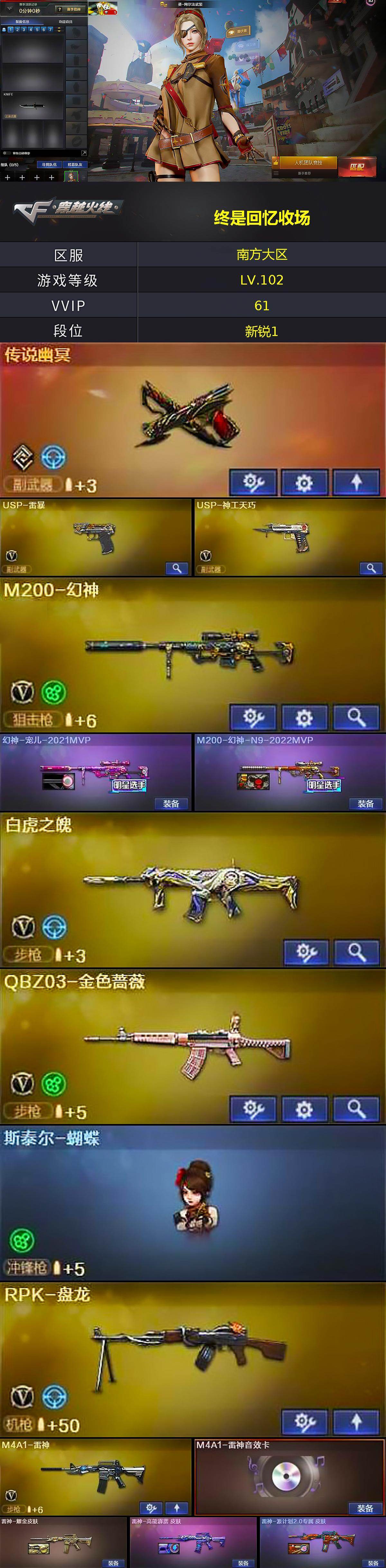 [17326957]南方大区-64V-3王者武器数-0炫金武器数 【传说武器】:传说幽冥 【热门武器】:传说幽冥,QBZ03-金色蔷薇,M200-幻神,M4A1-黑骑士,RPK-盘龙,斯泰尔-蝴蝶,USP-雷暴,沙鹰-修罗*3 【音效卡】:AK47-火麒麟音效卡,M4A1-雷神音效卡,M4A1-黑骑士音效卡,Barrett-毁灭音效卡,炼狱-百战金芒-庆典舞曲音效卡 【皮肤】:幻神-宠儿-2021MVP,M200-幻神-N9-2022MVP,雷神-耀金皮肤,雷神-高能霹雳 皮肤,雷神-源计划2.0专属 皮肤,火麒麟-轻羽皮肤,火麒麟-平天大圣,火麒麟-心动糖果,毁灭-暗月,毁灭-冠军之怒,毁灭-AG-CFPLS15冠军,毁灭-英雄计划 皮肤,轻型军用手斧-再燃火线,擎天-冠军之击 【角色】:零,葵,葵-阿尔法武装,暗夜-X,芳心审判者,风暴女*2,嘉年华灵狐,娟娟,灵狐者-职业经理,龙儿,麻雀,曼陀罗-X,潘多拉-X,斯沃特-X,铁骑荣耀,影武者-X,职业选手 【人偶武器】:斯泰尔-蝴蝶,AWM-灵狐-15周年嘉年华,迷你牛魔王,沙鹰-蓝水晶-曼陀罗,灵狐娃娃手雷 【挑战大师】:冰龙粉碎者-白马银枪,神圣爆裂者-末日III 【英雄级武器】:M4A1-千变,AK47-火麒麟*2,M4A1-黑龙,M4A1-雷神,M4A1-黑骑士,AK47-无影,M4A1-死神,AK12-天启,AK47-机械迷城,无影-神兵利器,M4A1-玫瑰精灵,QBZ03-金色蔷薇,王者之心-觉醒版,王者之势-觉醒版,黑骑士-海王,白虎之魄-觉醒版,机械迷城-穹宇,AWM-天龙,Barrett-毁灭,Barrett-极光,M200-幻神,Barrett-金色蔷薇,RPK-盘龙,沙鹰-修罗*3,沙鹰-天神*2,USP-雷暴,USP-神工天巧,屠龙*4,龙啸*2,擎天,唐刀-神工天巧,斩神刀-雷暴,麒麟刺-百战金芒,高爆手雷-雷暴*3,高爆手雷-神工天巧*2,闪光弹-雷暴*3,闪光弹-神工天巧*3,烟雾弹-雷暴*3,烟雾弹-神工天巧*3 【道具】:神秘礼盒背包,BS战队炫彩背包,炫彩背包,背包-葫芦兄弟,虎牙炫彩背包,女皇终结者-魔龙之吻,救世主-黑桃战神,绿色巨人,灵魂忍者*2,变异宝贝,迷雾幽灵*2,夺命之镰,防化服*3,金色流光-枪王排位*2,星辰流光-枪王排位,枪王排位29赛季金色流光,语音特效-盛典烟火,萌萌小