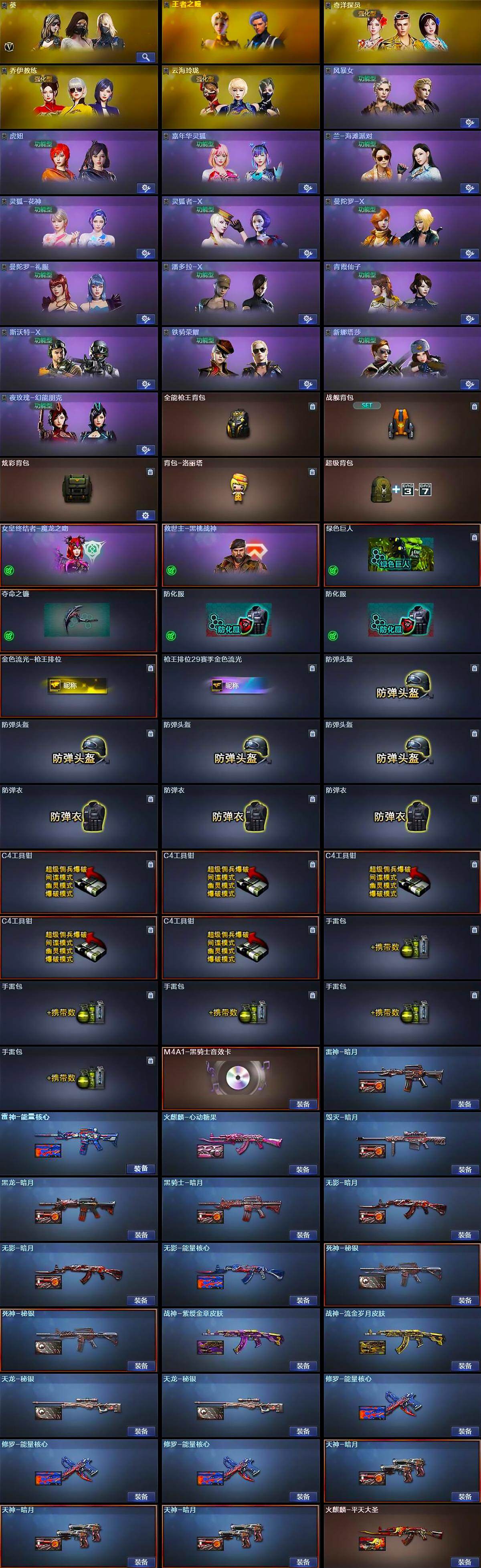 【道具】:全能枪王背包,战舰背包,炫彩背包,背包-洛丽塔,超级背包,女皇终结者-魔龙之吻,救世主-黑桃战神,绿色巨人,夺命之镰,防化服*2,金色流光-枪王排位,枪王排位29赛季金色流光,防弹头盔*4,防弹衣*3,C4工具钳*5,手雷包*5