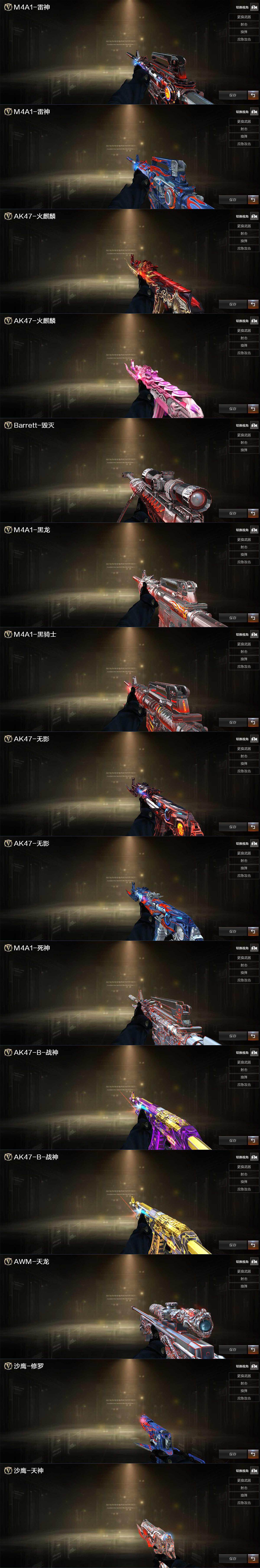 【英雄级武器】:M4A1-千变,AK47-火麒麟*4,M4A1-黑龙,M4A1-雷神*3,M4A1-黑骑士*2,AK47-无影,AK47-机械迷城,AK47-黑鲨,无影-神兵利器,王者之心-觉醒版,AK-47-猩红传说,机械迷城-穹宇,AWM-天龙*2,Barrett-毁灭,Barrett-金色蔷薇*2,AA-12-雷霆,沙鹰-修罗*8,沙鹰-天神,屠龙*5,龙啸*2,擎天,麒麟刺,M4A1-赤狱骑士