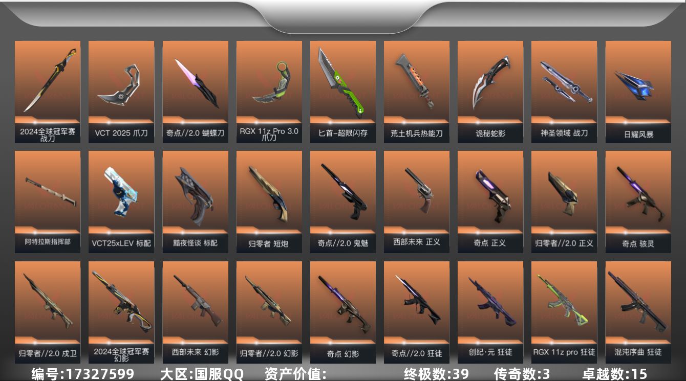 [17327599]【特价出售/店主推荐】 【套装】:2024全球冠军赛套装,VCT 2025 赛季套装,西部未来套装,归零者//2.0套装,奇点//2.0套装,回火礼包:奇点套装,般若假面//2.0套装,掠影套装 【英雄】:幻棱,炼狱,维斯,暮蝶,钛狐,壹决,铁臂,捷风,雷兹,幽影,不死鸟,贤者,猎枭,蝰蛇,零,芮娜,奇乐,尚勃勒,霓虹,斯凯,夜露,星礈,K/O,海神,盖可,黑梦,钢锁 【近战武器】:近战武器-2024全球冠军赛 战刀,近战武器-奇点//2.0 蝴蝶刀,近战武器-VCT 2025 爪刀,近战武器-RGX 11z Pro//3.0 爪刀,近战武器-鬼丸国纲,近战武器-未来开拓者,近战武器-超限闪存 匕首,近战武器-荒土机兵 热能刀,近战武器-生物分子解离器,近战武器-影刃,近战武器-诡秘蛇影 军刀,近战武器-神圣领域 战刀,近战武器-日耀风暴 遗器,近战武器-阿特拉斯指挥部 甩棍 【狂徒】:狂徒-洪荒怒焰,狂徒-混沌序曲,狂徒-奇点//2.0,狂徒-创·纪元,狂徒-RGX 11z Pro,狂徒-ORA x 颗秒,狂徒-般若假面//2.0,狂徒-掠影,狂徒-盖亚的复仇,狂徒-日冕雄师,狂徒-紫阙金琅,狂徒-离子武器//2.0,狂徒-超能偶像,狂徒-荒土机兵,狂徒-诡秘蛇影 【幻影】:幻影-2024全球冠军赛,幻影-归零者//2.0,幻影-奇点,幻影-西部未来,幻影-侦察力量,幻影-超限闪存,幻影-神圣领域,幻影-纳米打击,幻影-末日之翼,幻影-西部未来 【戍卫】:戍卫-归零者//2.0,戍卫-掠影,戍卫-天界神兵,戍卫-超能偶像,戍卫-浮光跃金,戍卫-逆冲蛮牛,戍卫-月球哨兵,戍卫-折光棱晶 【獠犬】:獠犬-源能者娱乐系统,獠犬-般若假面//2.0,獠犬-神圣领域,獠犬-采蜜小蜂队,獠犬-模拟赫兹,獠犬-逆冲蛮牛 【冥驹】:冥驹-千灵华绽,冥驹-掠影,冥驹-荒土机兵,冥驹-模拟赫兹,冥驹-星云暗涌 【飞将】:飞将-黯夜怪谈,飞将-西部未来,飞将-聚合之力,飞将-末日之翼 【莽侠】:莽侠-RGX 11z Pro//3.0,莽侠-归零者//2.0,莽侠-超限闪存,莽侠-诡秘蛇影,莽侠-月球哨兵 【战神】:战神-般若假面//2.0,战神-神圣领域,战神-采蜜小蜂队,战神-浮光跃金 【奥丁】:奥丁-西部未来,奥丁-纳米打击,奥丁-末日之翼 【判官】:判官-超能偶像,判官-诡秘蛇
