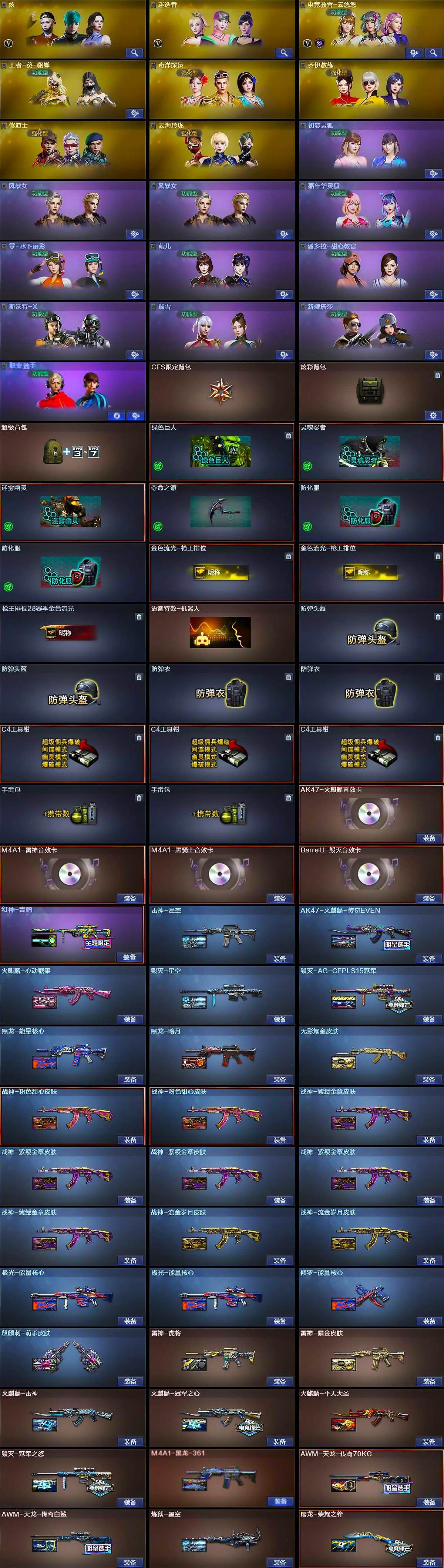 【皮肤】:幻神-青鹤,雷神-星空,雷神-虎将,雷神-耀金皮肤,火麒麟-雷神,火麒麟-冠军之心,AK47-火麒麟-传奇EVEN,火麒麟-平天大圣,火麒麟-心动糖果,毁灭-星空,毁灭-冠军之怒,毁灭-AG-CFPLS15冠军,毁灭-英雄计划 皮肤,黑龙-能量核心,黑龙-暗月,M4A1-黑龙-361,无影耀金皮肤,战神-粉色甜心皮肤*2,战神-紫绶金章皮肤*5,战神-流金岁月皮肤*2,AWM-天龙-传奇70KG,AWM-天龙-传奇白鲨,极光-能量核心*2,炼狱-星空,修罗-能量核心,屠龙-荣耀之锋,麒麟刺-萌杀皮肤