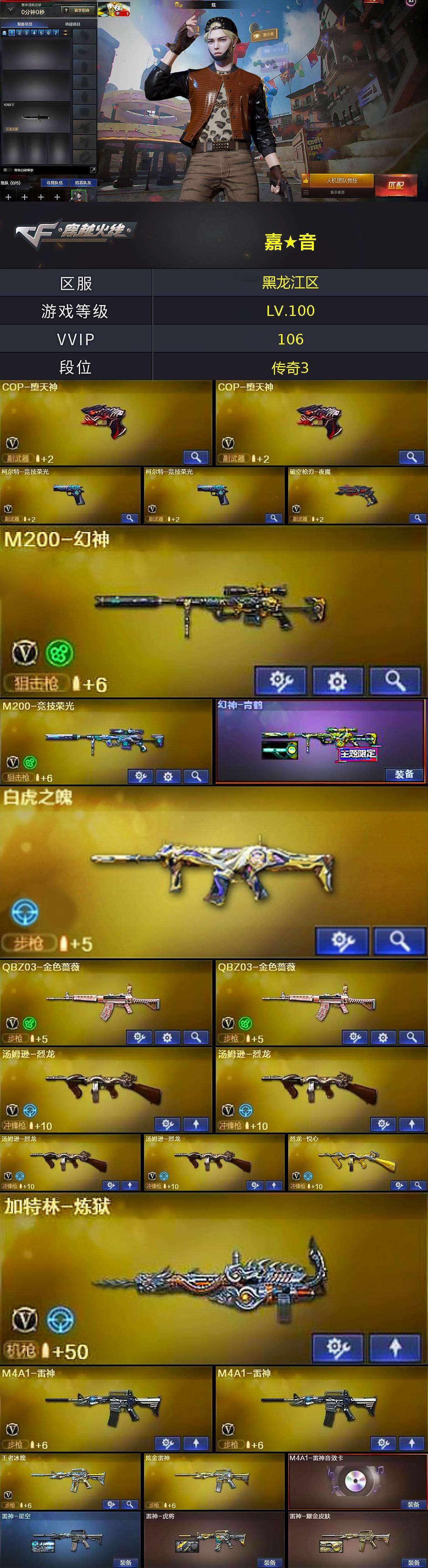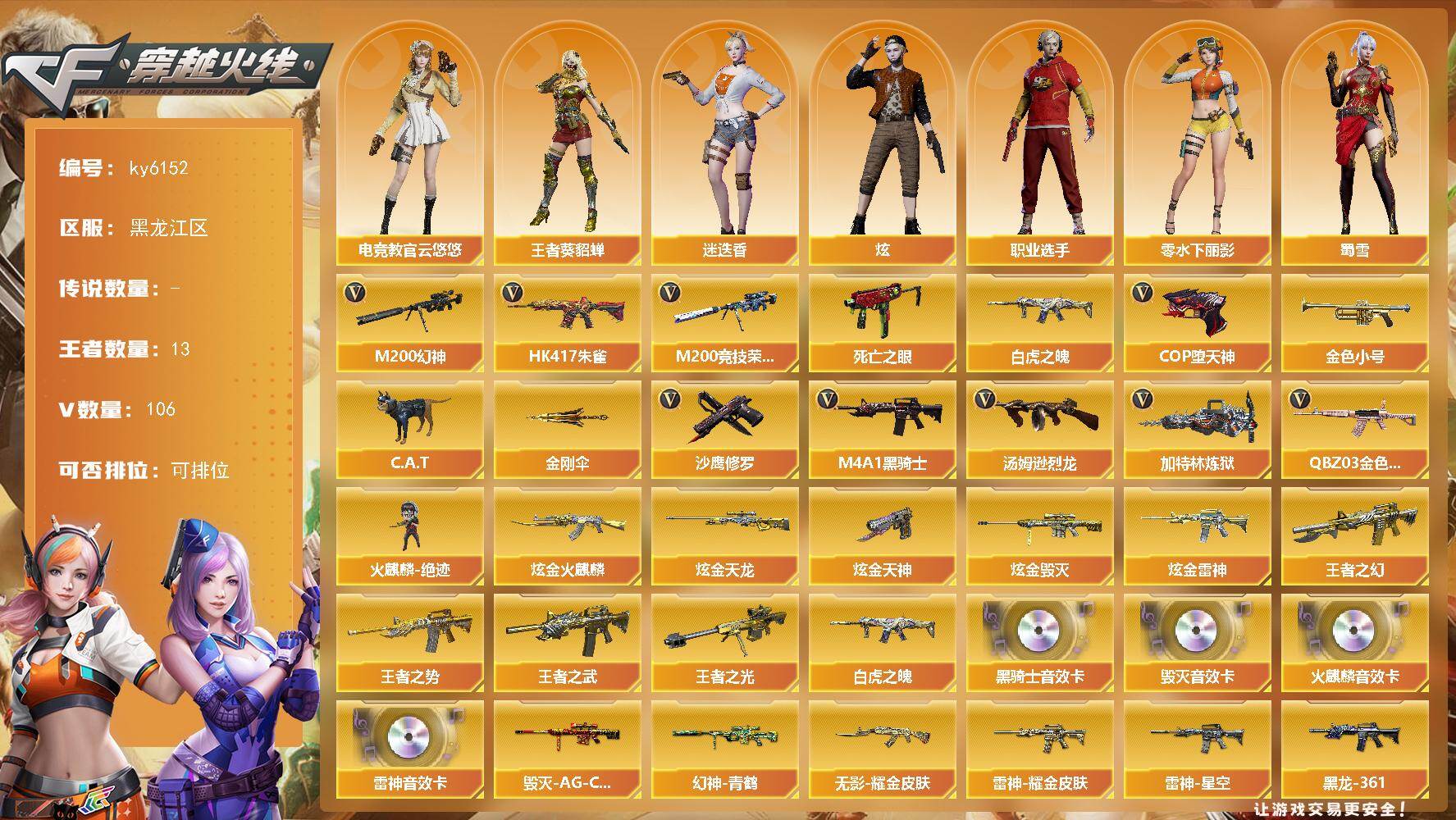 [17327874]黑龙江区-115V-13王者武器数-5炫金武器数 【热门武器】:QBZ03-金色蔷薇*2,HK417-朱雀,M200-幻神,M200-竞技荣光,死亡之眼,白虎之魄,金色小号,C.A.T,M4A1-黑骑士,汤姆逊-烈龙*4,加特林-炼狱,火麒麟-绝迹,COP-堕天神*2,沙鹰-修罗*4,金刚伞 【王者炫金武器】:王者之幻,王者之势,王者之武,白虎之魄,王者之光*2,炫金火麒麟,炫金雷神,炫金毁灭,炫金天龙,炫金天神 【音效卡】:AK47-火麒麟音效卡,M4A1-雷神音效卡,M4A1-黑骑士音效卡,Barrett-毁灭音效卡 【皮肤】:幻神-青鹤,雷神-星空,雷神-虎将,雷神-耀金皮肤,火麒麟-雷神,火麒麟-冠军之心,AK47-火麒麟-传奇EVEN,火麒麟-平天大圣,火麒麟-心动糖果,毁灭-星空,毁灭-冠军之怒,毁灭-AG-CFPLS15冠军,毁灭-英雄计划 皮肤,黑龙-能量核心,黑龙-暗月,M4A1-黑龙-361,无影耀金皮肤,战神-粉色甜心皮肤*2,战神-紫绶金章皮肤*5,战神-流金岁月皮肤*2,AWM-天龙-传奇70KG,AWM-天龙-传奇白鲨,极光-能量核心*2,炼狱-星空,修罗-能量核心,屠龙-荣耀之锋,麒麟刺-萌杀皮肤 【角色】:炫,迷迭香,电竞教官-云悠悠,王者-葵-貂蝉,奇洋探员,乔伊教练,修道士,云海玲珑,初恋灵狐,风暴女*2,嘉年华灵狐,零-水下丽影,萌儿,潘多拉-甜心教官,斯沃特-X,蜀雪,新娜塔莎,职业选手 【人偶武器】:火麒麟-绝迹,M4A1-雷神-精英刀锋,巴雷特-零-水下丽影*2,AWM-灵狐-15周年嘉年华,COP-旗袍,C.A.T,迷你深渊冰龙,闪光弹-小乔 【暴走生化】:死亡之眼 【挑战大师】:神圣爆裂者III,AK47-冰龙粉碎者,激光毁灭者III,神圣爆裂者-末日III,阐释者III 【英雄级武器】:M4A1-千变,AK47-火麒麟*2,M4A1-黑龙,M4A1-雷神*2,M4A1-黑骑士,AK47-无影,AK47-黑武士*2,AK47-黑鲨,M4A1-龙血,M4A1-堕天神,HK417-朱雀,M4A1-玫瑰精灵*4,QBZ03-金色蔷薇*2,9A91-烈火,王者之心-觉醒版,王者之势-觉醒版*2,AK-47-猩红传说*4,AK47-B-战神,王者冰魄-觉醒版,AWM-天龙,Barrett-毁灭,Barrett-极光,M200-