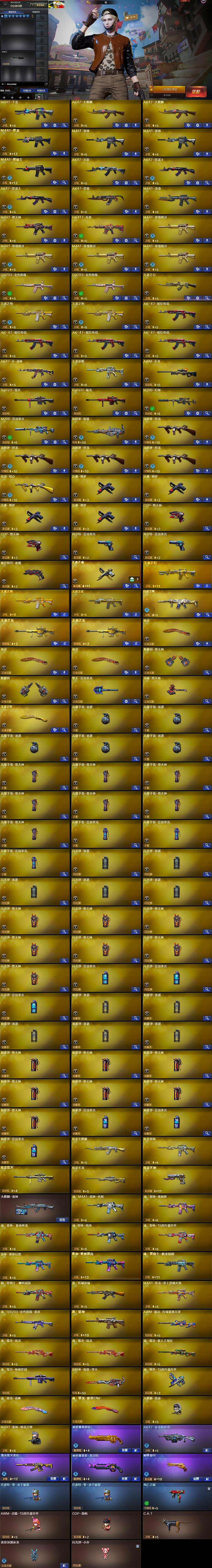 【热门武器】:QBZ03-金色蔷薇*2,HK417-朱雀,M200-幻神,M200-竞技荣光,死亡之眼,白虎之魄,金色小号,C.A.T,M4A1-黑骑士,汤姆逊-烈龙*4,加特林-炼狱,火麒麟-绝迹,COP-堕天神*2,沙鹰-修罗*4,金刚伞