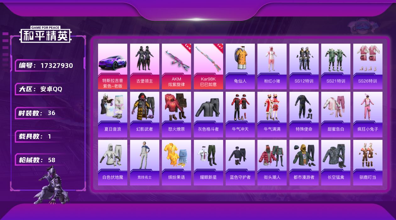[17327930]【特价出售/店主推荐】安卓 手Q-1粉装-2特效枪-1载具-1粉色飞行器-19500热力值-2王牌印记-36套装-58枪皮 【热门品类】:套装-龟仙人,套装-粉红小猪 【粉色套装】:粉装-古堡领主 【粉色枪皮等级】:AKM-炫紫旋律(四级),Kar98K-巳巳如意(一级) 【粉色载具】:特斯拉Model X(奇幻紫) 【粉色枪皮】:AKM-炫紫旋律,Kar98K-巳巳如意 【粉色飞行器】:古堡领主飞行器 【粉色降落伞】:炫紫旋律降落伞,古堡领主降落伞,伏魔团降落伞 【稀有套装】:套装-龟仙人 【稀有枪皮】:AKM-玉龙,AKM-破晓战魂,AKM-锦绣火鲤,M16A4-快乐主宰,M16A4-机械英豪,SCAR-L-玉兔迎春,M416-红色方程式,M416-绯红前夜,M416-蓝色火焰,AUG-PEC最牛战神,AUG-天降萌叽,QBZ-彩虹符号,M762-绯红前夜,蜜獾-天降萌叽,蜜獾-娇憨猪猪,UZI-古堡领主,UZI-天降萌叽,UZI-娇憨猪猪,UMP45-快乐主宰,UMP45-蓝色火焰,Vector-生命誓言,野牛-机械英豪,P90-巳巳如意,Kar98K-PEC最牛战神,Kar98K-古堡领主,VSS-彩虹符号,Win94-机械英豪,SLR-PEC最牛战神,S686-生命誓言,S12K-娇憨猪猪,S12K-机械英豪,M249-古堡领主 【其他套装】:套装-SS12特训,套装-SS21特训,套装-SS26特训,套装-夏日音浪,套装-幻影武者,套装-怒火燎原,套装-灰色格斗者,套装-牛气冲天,套装-牛气满满,套装-特殊使命,套装-甜蜜告白,套装-疯狂小兔子,套装-白色伏地魔,套装-竞技名士,套装-粉红小猪,套装-缤纷果语,套装-耀眼新星,套装-蓝色守护者,套装-街头潮人,套装-都市漫游者,套装-长空猛禽,套装-驯鹿叮当,套装-骑行爱好者,套装-黄色运动,套装-龟仙人,套装-战地菁英,套装-雪山精英,套装-红酒骑士,套装-舞夜骑士,套装-机械英豪,套装-机械征服者,套装-机械冒险家,套装-PEC最牛战神,套装-萌趣咩咩 【稀有背包】:静灵氛围潮音背包(3级),静灵氛围潮音背包(2级),静灵氛围潮音背包(1级),古堡领主背包(3级),古堡领主背包(2级),古堡领主背包(1级) 【营地ID】:599231493