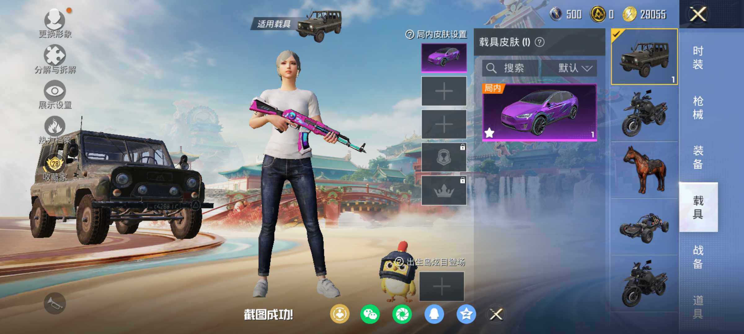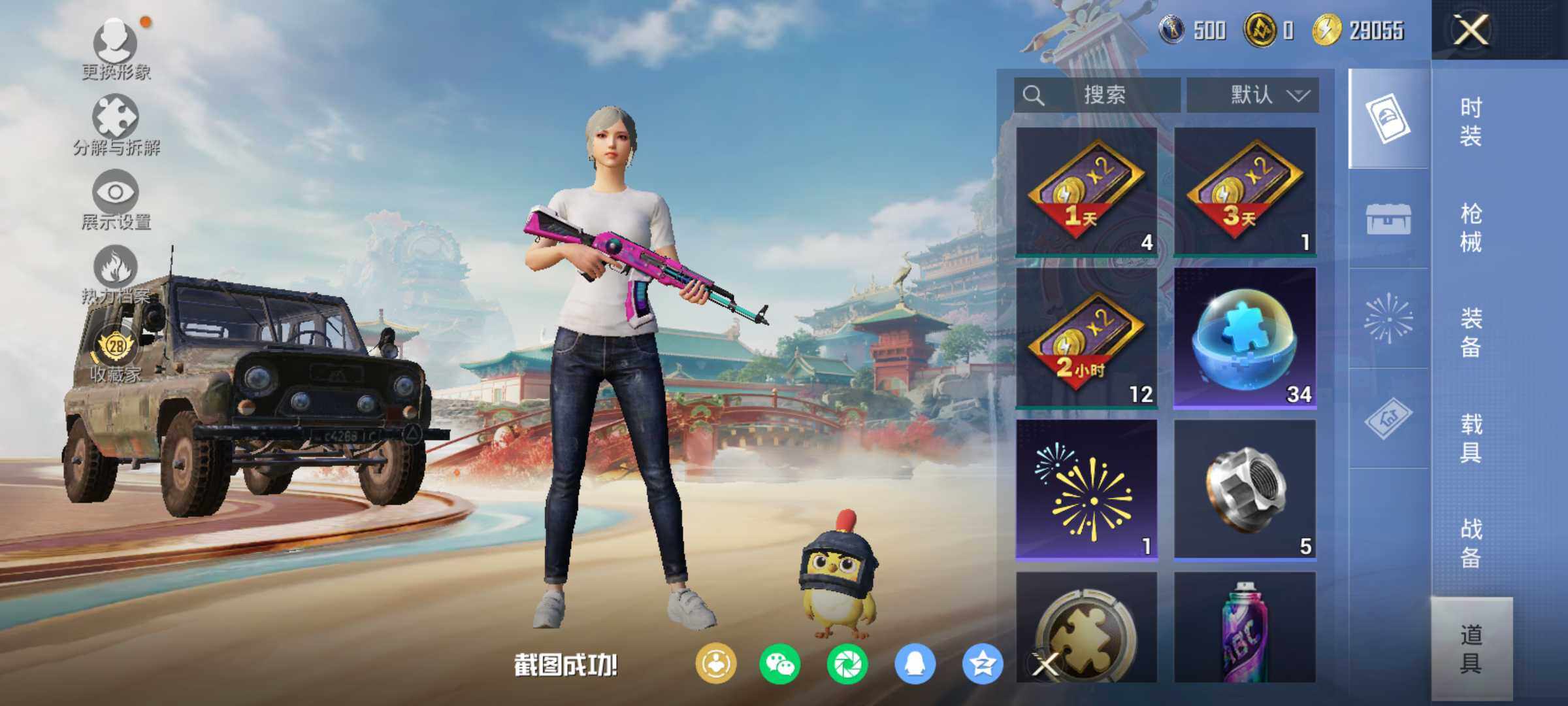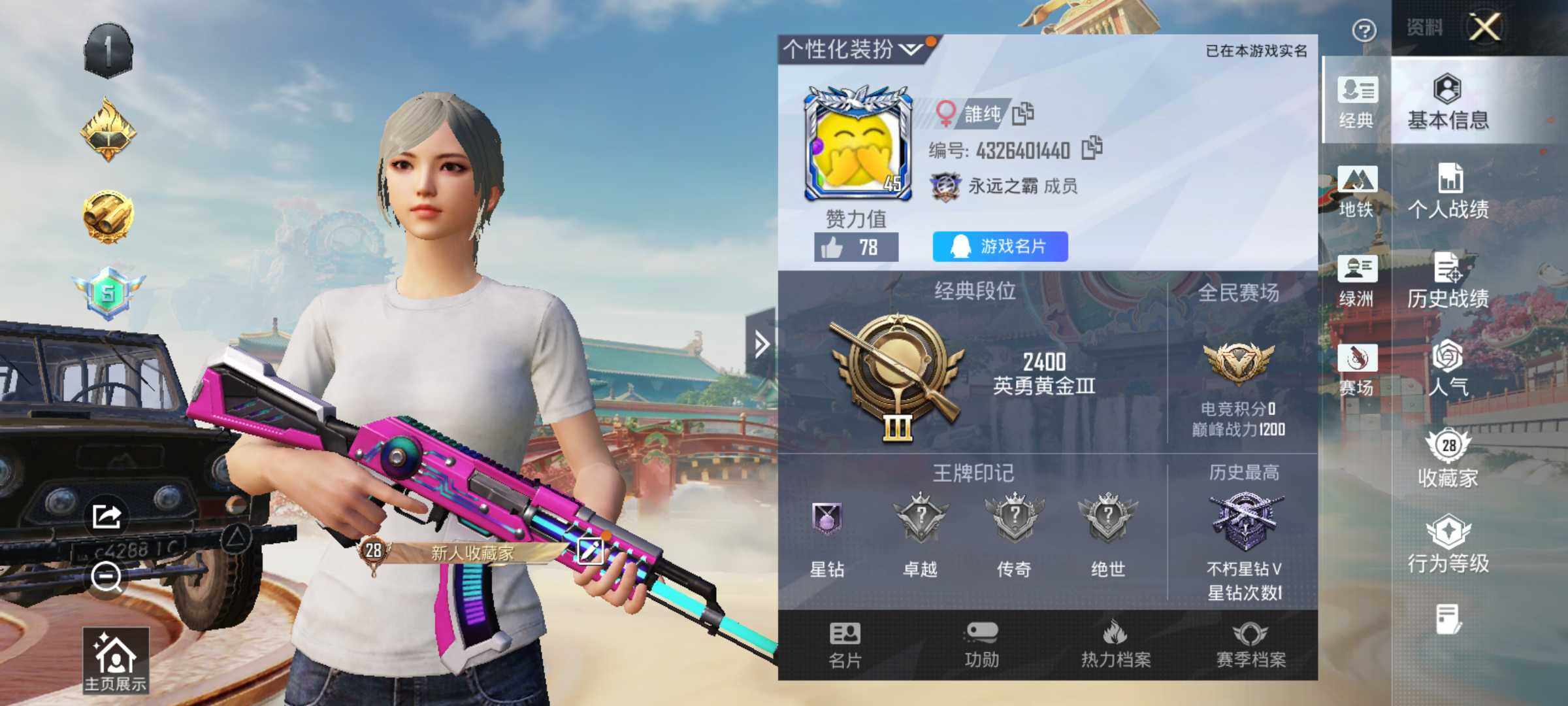 - [16434599]【店主推荐捡漏号!可直接换绑】苹果 手Q-1粉装-3特效枪-1载具-1粉色飞行器-34713热力值-4王牌印记-111套装-108枪皮【热门品类】:套装-浪漫天命,套装-暗影哥特【粉色套装】:粉装-暗星紫秘【粉色枪皮等级】:Kar98K-巳巳如意(二级),SLR-暗夜玫瑰(五级),DP-28-豹影疾电(五级)【粉色载具】:海龙奔腾【粉色枪皮】:Kar98K-巳巳如意,SLR-暗夜玫瑰,DP-28-豹影疾电