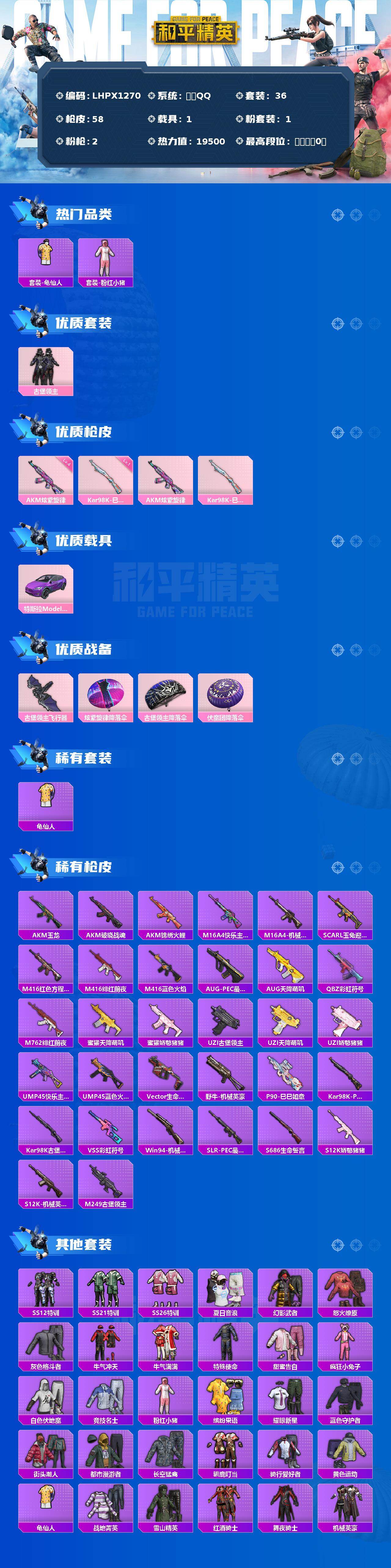 - [15243214]男神素材号【特价急出/详情看图】:安卓 手Q-12粉装-14特效枪-4载具-9.6w热力值-13印记-179套装-273枪皮【热门品类】:套装-寒蝎幽灵,套装-派对舞王,角色-军刀雅典娜,套装-胖达圆圆,套装-都市猎人【粉色载具】:特斯拉Roadster(水滴蓝),兰博基尼Aventador SVJ(翡翠绿),合金龙骨(绿),护世瑞兽【粉色套装】:粉装-未来战士,粉装-梦幻火箭,粉装-炙焰红王,粉装-银龙傲海,粉装-山涧鹿灵,粉装-蓝莓炮弹,角色-复仇流浪者,粉装-霁雪冰心,粉装-音爆索尼克,粉装-金丰海韵,角色-千金淑猫,粉装-雪月幻音【粉色枪皮等级】:AKM-梦之光华(七级),AKM-绿萝繁花(三级),SCAR-L-童趣迷兔(七级),M416-风花雪月(五级),GROZA-旋转彩虹(七级),AUG-暖羊咩咩(五级),AUG-圣斗士星矢(五级),M762-青锋波束(五级),UMP45-量子极限(五级),Kar98K-未来歌姬(二级),Kar98K-巳巳如意(五级),Mk14-盛世惊鸿(三级),平底锅-林间仙鹿(七级),破片手榴弹-热量炸弹(五级)【粉色飞行器】:梦幻火箭飞行器,天之羽翼飞行器,太空嘟嘟飞行器,冠军兔兔飞行器,深渊漩涡飞行器,曦光华影飞行器,凤舞九天飞行器,万象金身飞行器,月下星之子飞行器,墨金战记飞行器