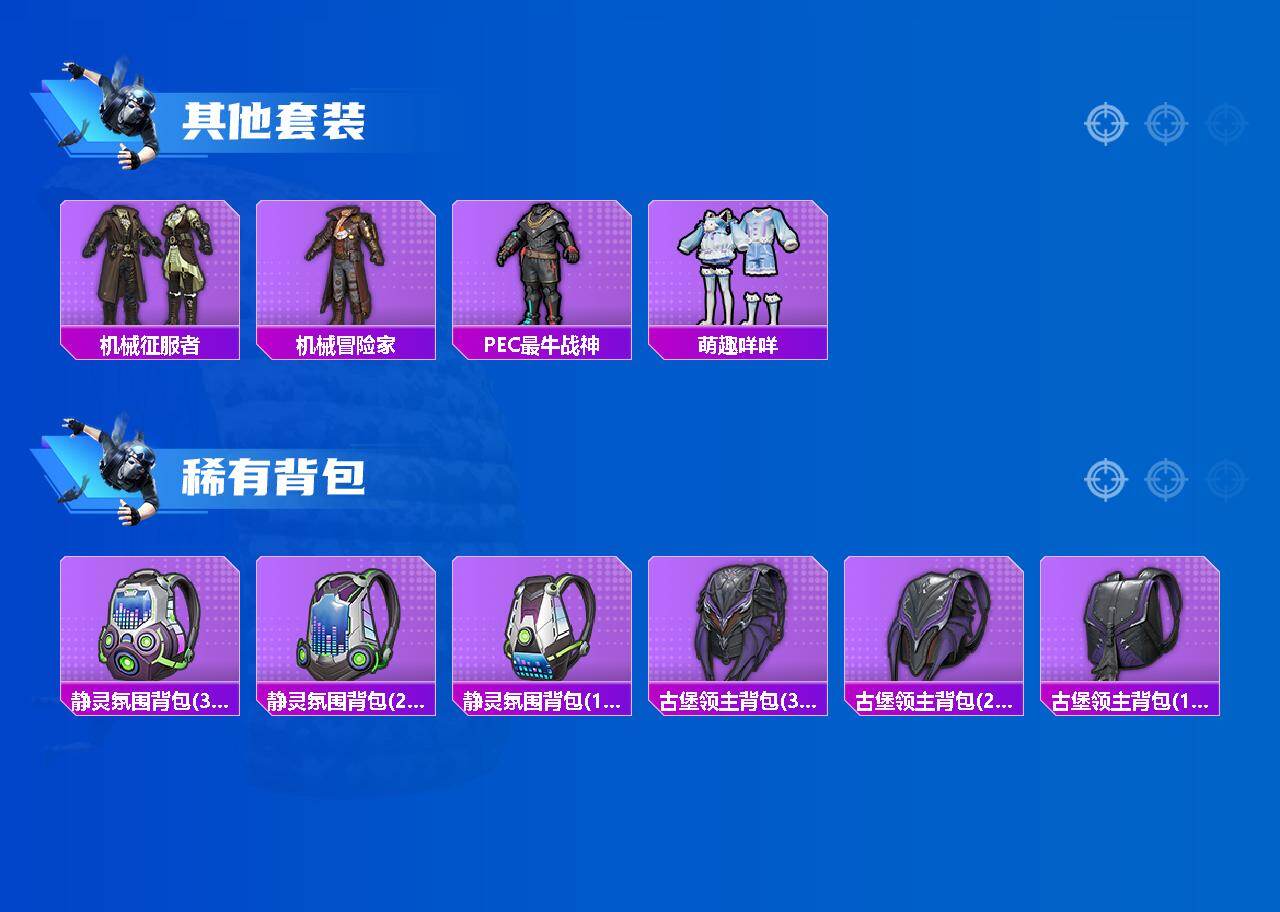 【其他套装】:套装-SS12特训,套装-SS21特训,套装-SS26特训,套装-夏日音浪,套装-幻影武者,套装-怒火燎原,套装-灰色格斗者,套装-牛气冲天,套装-牛气满满,套装-特殊使命,套装-甜蜜告白,套装-疯狂小兔子,套装-白色伏地魔,套装-竞技名士,套装-粉红小猪,套装-缤纷果语,套装-耀眼新星,套装-蓝色守护者,套装-街头潮人,套装-都市漫游者,套装-长空猛禽,套装-驯鹿叮当,套装-骑行爱好者,套装-黄色运动,套装-龟仙人,套装-战地菁英,套装-雪山精英,套装-红酒骑士,套装-舞夜骑士,套装-机械英豪,套装-机械征服者,套装-机械冒险家,套装-PEC最牛战神,套装-萌趣咩咩