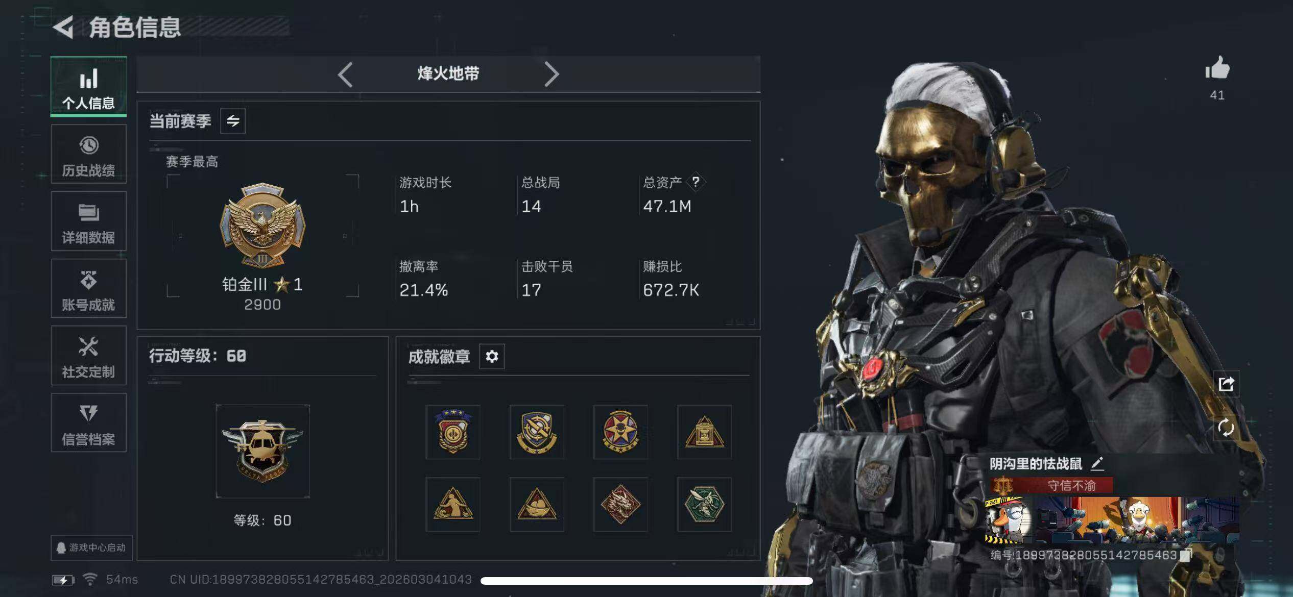 [17328030]可二次【特价出售/店主推荐】47m总资产-27531k哈伏币-60烽火等级-铂金-17战场等级-列兵