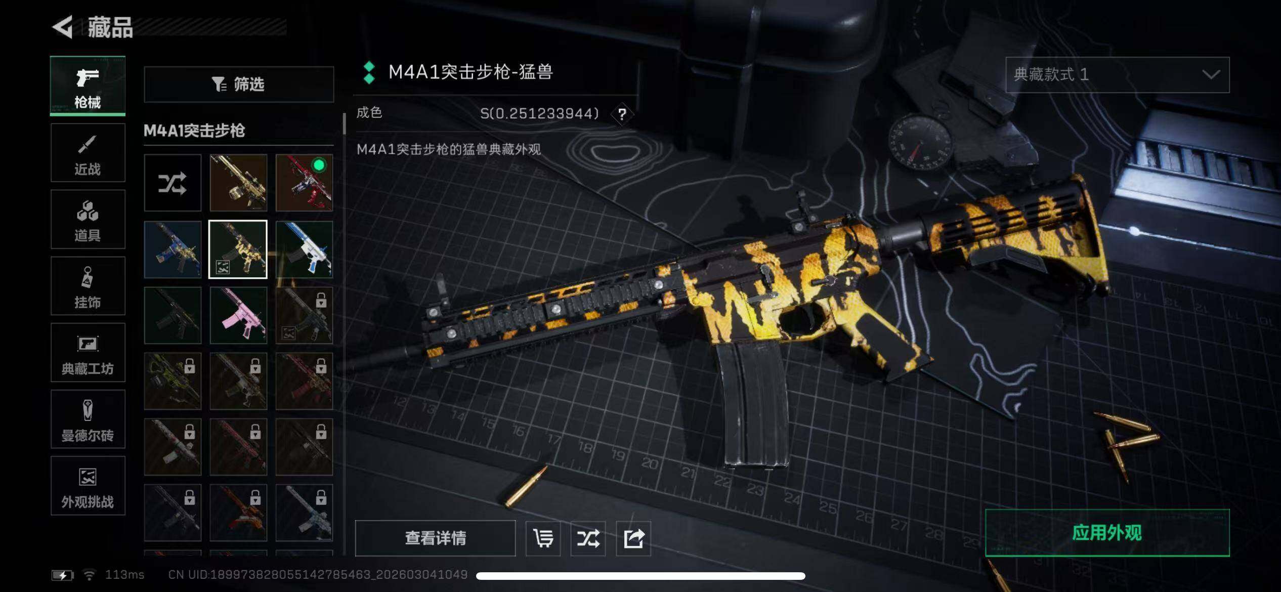 【传说外观】:M4A1突击步枪-蚀金玫瑰,M4A1突击步枪-阿米娅,AKM突击步枪-锦绣,ASh-12战斗步枪-鹅鸭杀,M16A4突击步枪-狩猎时刻,SG552突击步枪-运动员,AK-12突击步枪-特斯拉线圈,SCAR-H战斗步枪-启航,G3战斗步枪-狩猎时刻,CAR-15突击步枪-阿米娅,K437突击步枪-北极星,KC17突击步枪-电锯惊魂,Vector冲锋枪-狩猎时刻,UZI冲锋枪-特斯拉线圈,SR-3M紧凑突击步枪-特斯拉线圈,SR-3M紧凑突击步枪-荼蘼,勇士冲锋枪-能天使-午夜邮差,QCQ171冲锋枪-北极星,QCQ171冲锋枪-鹅鸭杀,725双管霰弹枪-送葬人-无题密令,M250通用机枪-骑士之心,QJB201轻机枪-鹅鸭杀,M14射手步枪-缄花,SKS射手步枪-骑士,SR-25射手步枪-缄花,.357左轮-缄花,复合弓-黑·天际线
