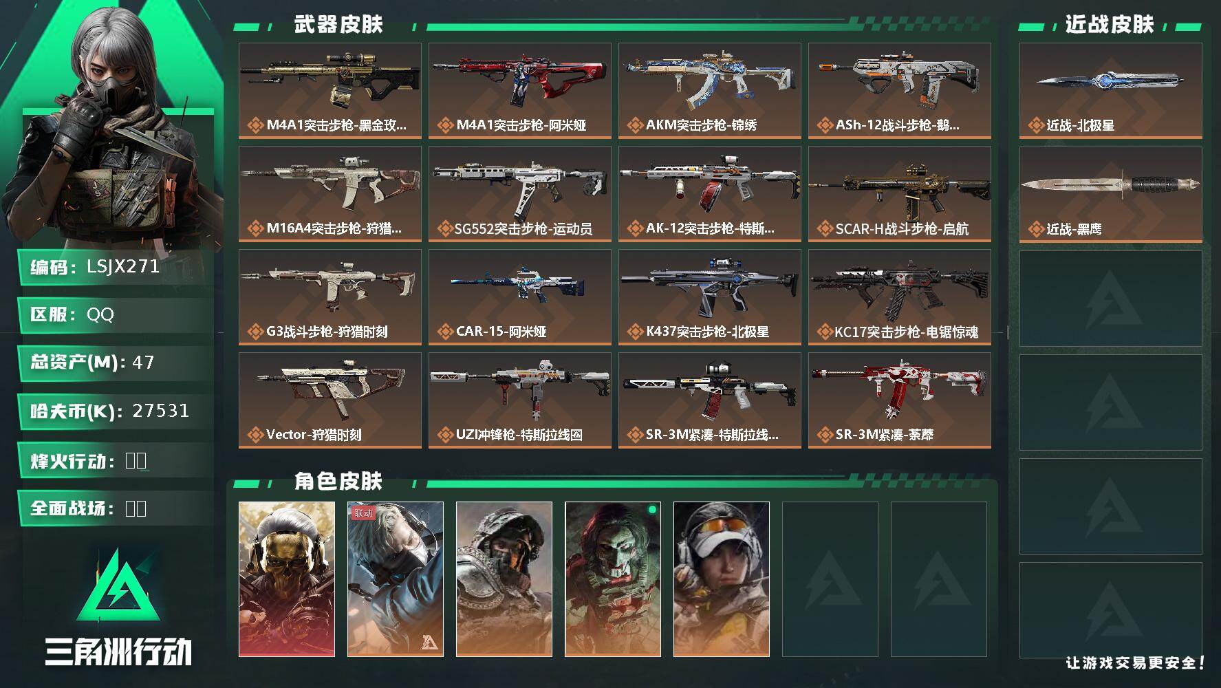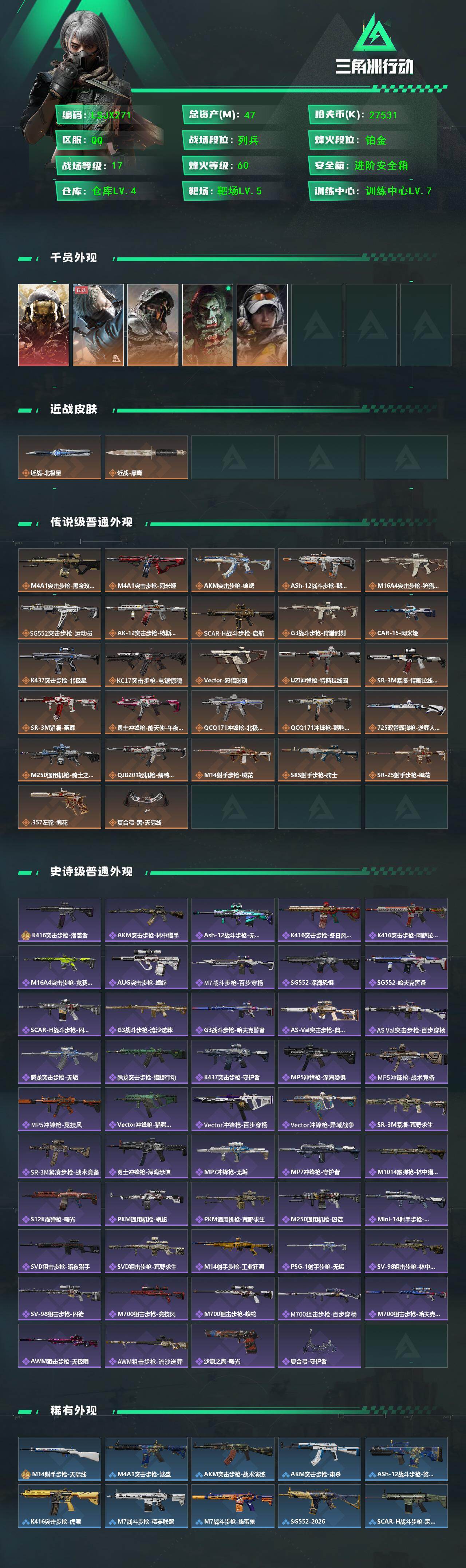 [17328030]可二次【特价出售/店主推荐】47m总资产-27531k哈伏币-60烽火等级-铂金-17战场等级-列兵 【干员外观】:红狼-蚀金玫瑰,蜂医-送葬人·无题密令,深蓝-不破誓约,红狼-电锯惊魂,露娜-金牌射手 【近战皮肤】:近战-北极星,近战-黑鹰 【传说外观】:M4A1突击步枪-蚀金玫瑰,M4A1突击步枪-阿米娅,AKM突击步枪-锦绣,ASh-12战斗步枪-鹅鸭杀,M16A4突击步枪-狩猎时刻,SG552突击步枪-运动员,AK-12突击步枪-特斯拉线圈,SCAR-H战斗步枪-启航,G3战斗步枪-狩猎时刻,CAR-15突击步枪-阿米娅,K437突击步枪-北极星,KC17突击步枪-电锯惊魂,Vector冲锋枪-狩猎时刻,UZI冲锋枪-特斯拉线圈,SR-3M紧凑突击步枪-特斯拉线圈,SR-3M紧凑突击步枪-荼蘼,勇士冲锋枪-能天使-午夜邮差,QCQ171冲锋枪-北极星,QCQ171冲锋枪-鹅鸭杀,725双管霰弹枪-送葬人-无题密令,M250通用机枪-骑士之心,QJB201轻机枪-鹅鸭杀,M14射手步枪-缄花,SKS射手步枪-骑士,SR-25射手步枪-缄花,.357左轮-缄花,复合弓-黑·天际线 【史诗外观】:K416突击步枪-潜袭者,AKM突击步枪-林中猎手,ASh-12战斗步枪-无极限,K416突击步枪-冬日风情,K416突击步枪-阿萨拉特攻,M16A4突击步枪-竞赛选手,AUG突击步枪-蝮蛇,M7战斗步枪-百步穿杨,SG552突击步枪-深海恐惧,SG552突击步枪-哈夫克警备,SCAR-H战斗步枪-囚徒,G3战斗步枪-流沙送葬,G3战斗步枪-哈夫克警备,AS Val突击步枪-典狱官,AS Val突击步枪-百步穿杨,腾龙突击步枪-无垢,腾龙突击步枪-猎鳄行动,K437突击步枪-守护者,MP5冲锋枪-深海恐惧,MP5冲锋枪-战术竞备,MP5冲锋枪-竞技风,Vector冲锋枪-猎鳄行动,Vector冲锋枪-百步穿杨,Vector冲锋枪-异域战争,SR-3M紧凑突击步枪-荒野求生,SR-3M紧凑突击步枪-战术竞备,勇士冲锋枪-深海恐惧,MP7冲锋枪-无垢,MP7冲锋枪-守护者,M1014霰弹枪-林中猎手,S12K霰弹枪-曙光,PKM通用机枪-蝮蛇,PKM通用机枪-荒野求生,M250通用机枪-囚徒,Mini-14射手步枪-守护者,SVD狙击步枪-暗夜猎手,SVD狙击步枪-荒野求生