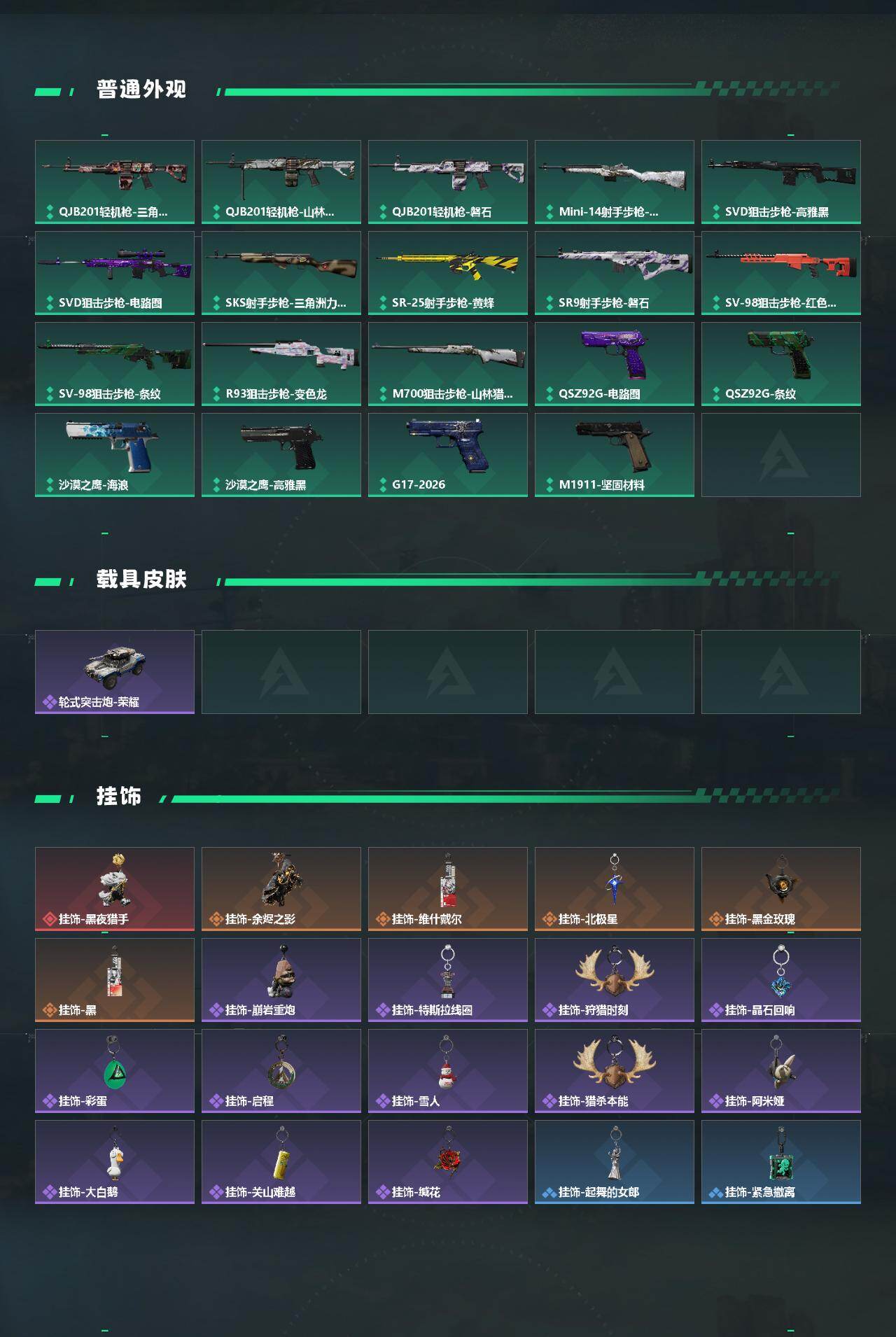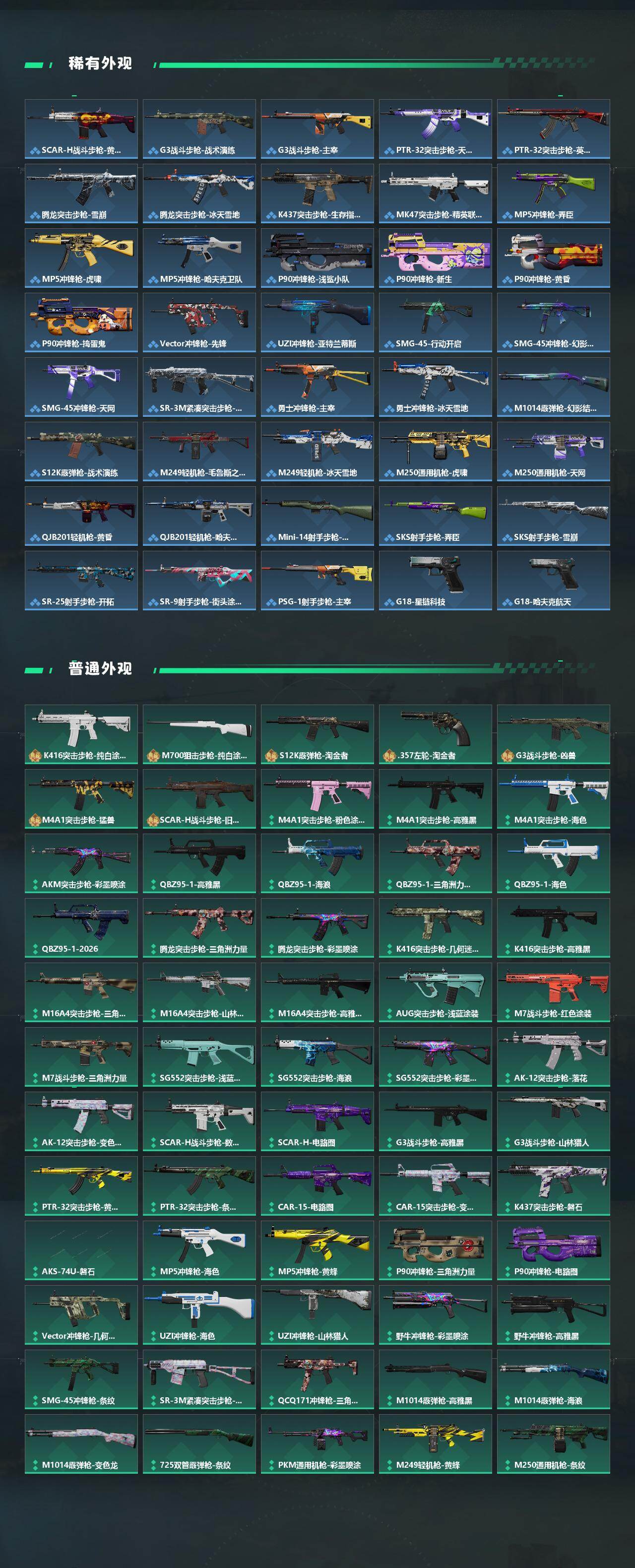 【史诗外观】:K416突击步枪-潜袭者,AKM突击步枪-林中猎手,ASh-12战斗步枪-无极限,K416突击步枪-冬日风情,K416突击步枪-阿萨拉特攻,M16A4突击步枪-竞赛选手,AUG突击步枪-蝮蛇,M7战斗步枪-百步穿杨,SG552突击步枪-深海恐惧,SG552突击步枪-哈夫克警备,SCAR-H战斗步枪-囚徒,G3战斗步枪-流沙送葬,G3战斗步枪-哈夫克警备,AS Val突击步枪-典狱官,AS Val突击步枪-百步穿杨,腾龙突击步枪-无垢,腾龙突击步枪-猎鳄行动,K437突击步枪-守护者,MP5冲锋枪-深海恐惧,MP5冲锋枪-战术竞备,MP5冲锋枪-竞技风,Vector冲锋枪-猎鳄行动,Vector冲锋枪-百步穿杨,Vector冲锋枪-异域战争,SR-3M紧凑突击步枪-荒野求生,SR-3M紧凑突击步枪-战术竞备,勇士冲锋枪-深海恐惧,MP7冲锋枪-无垢,MP7冲锋枪-守护者,M1014霰弹枪-林中猎手,S12K霰弹枪-曙光,PKM通用机枪-蝮蛇,PKM通用机枪-荒野求生,M250通用机枪-囚徒,Mini-14射手步枪-守护者,SVD狙击步枪-暗夜猎手,SVD狙击步枪-荒野求生