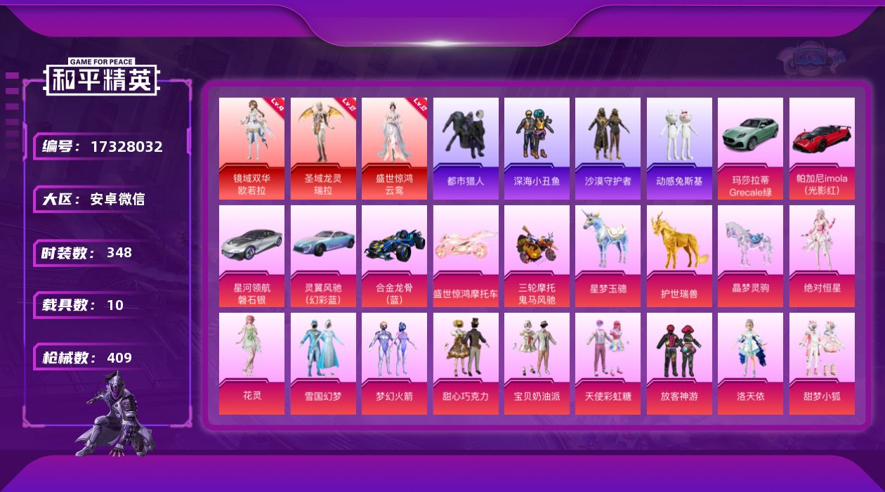 [17328032]【特价出售/店主推荐】安卓 微信-无敌战神框-3神装-43粉装-25特效枪-10载具-20粉色飞行器-181028热力值-25王牌印记-348套装-409枪皮 【红色神装等级】:圣域龙灵-瑞拉(二级),盛世惊鸿-云鸾(二级),镜域双华-欧若拉(四级) 【红色角色神装】:圣域龙灵-瑞拉,盛世惊鸿-云鸾,镜域双华-欧若拉 【热门品类】:粉装-雪国幻梦,粉装-梦幻火箭,套装-浪漫天命,套装-都市猎人,套装-深海小丑鱼,套装-小丑鱼,角色-军刀雅典娜,套装-沙漠守护者,套装-动感兔斯基人偶服,套装-龟仙人,套装-潮萌小黄鸭,套装-暗影哥特,套装-粉红小猪,角色-8号机,角色-Mark.06,套装-红熊茄茄 【粉色套装】:角色-绝对恒星,粉装-甜心巧克力,粉装-宝贝奶油派,粉装-天使彩虹糖,粉装-雪国幻梦,粉装-梦幻火箭,粉装-放客神游,角色-洛天依,粉装-甜梦小狐,粉装-妙趣可丽,粉装-彩虹甜喵,粉装-冰川红玫,粉装-霞光圣骑,粉装-寒光使者,粉装-暗夜鎏金,粉装-第五大道,角色-白勺歌姬,粉装-暖暖奶龙,角色-圣堂之誓,粉装-蜜语绒猫,角色-美琪,角色-鸢尾晶梦,角色-星梦奇缘,角色-冰域雷影,角色-狂花道·不知火舞,角色-千金淑猫,角色-萨利娅,角色-女娲灵识,角色-晶梦幻蝶,角色-樱桃泡泡,粉装-桃粉嫣然,粉装-戏水时光,粉装-雪月幻音,角色-智耀战神,粉装-绯果甜心,粉装-星穹咏叹调,角色-狂魅哈莉,角色-冷漠罗丽,角色-花灵,人物-小舞·雪昙,角色-极地冰晶 【粉色枪皮等级】:AKM-幽焰骑士(三级),SCAR-L-桃夭倾城(七级),M416-女娲灵识(三级),GROZA-镜光银凌(五级),AUG-暖羊咩咩(五级),UMP45-萌骑冒险(五级),AKS-74U-信仰神谕(七级),P90-冷漠罗丽(六级),Kar98K-巳巳如意(五级),Kar98K-圣域龙灵(三级),M24-镜域双华(三级),Mk14-盛世惊鸿(三级),Mk14-樱桃泡泡(三级),Mk14-福马献瑞(一级),AMR-智耀战神(五级),M417-第五大道(六级),SVD-月影灵韵(四级),MK12-雪月幻音(四级),DP-28-千金淑猫(七级),DP-28-豹影疾电(五级),MG-36-幻彩电音(四级),MG-36-虹云熊熊(五级),平底锅-桃粉嫣然(六级),烟雾弹-丁香清露(四级),破片手榴弹-