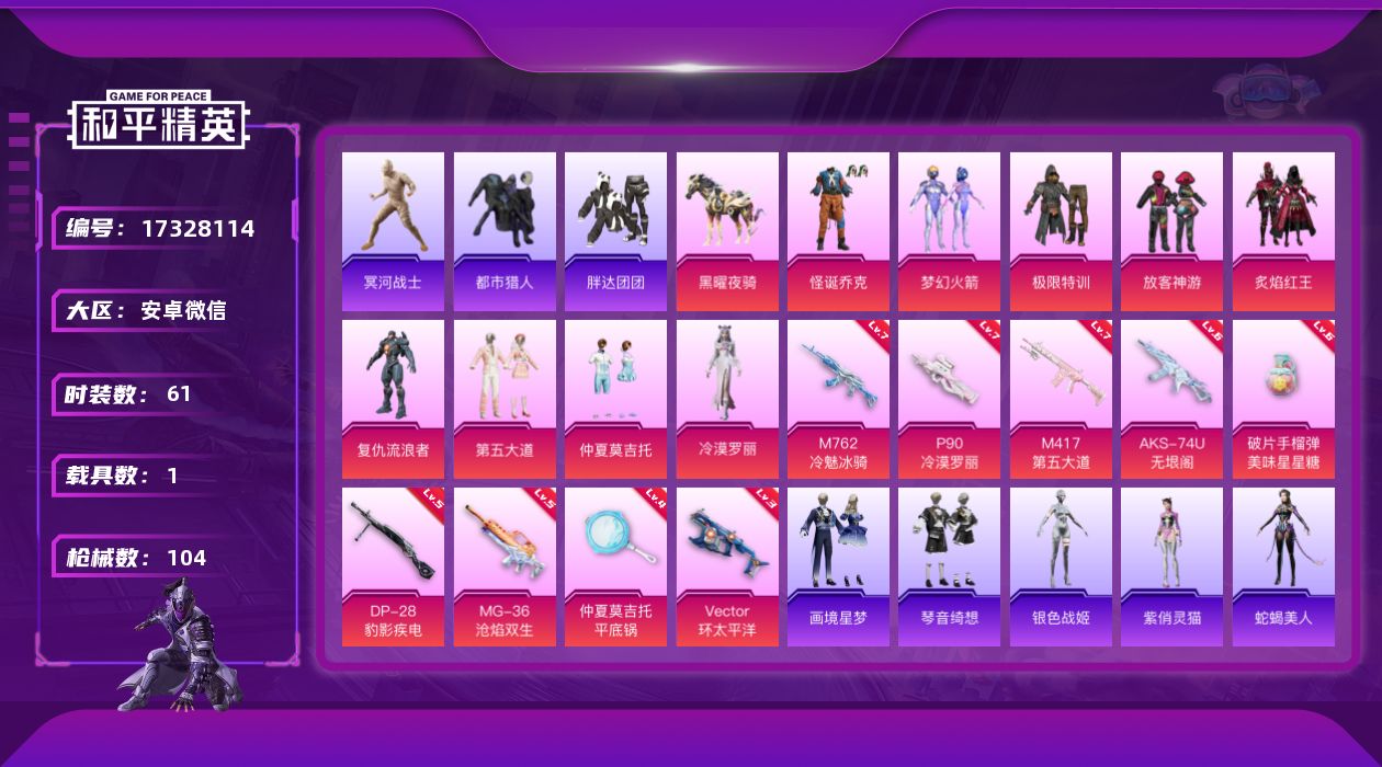 [17328114]【店主推荐捡漏号!可直接换绑】安卓 微信-9粉装-10特效枪-1载具-2粉色飞行器-37359热力值-1王牌印记-61套装-104枪皮【热门品类】:粉装-怪诞乔克,粉装-梦幻火箭,套装-浪漫天命,套装-都市猎人,套装-冥河战士,角色-军刀雅典娜,套装-胖达团团【粉色套装】:粉装-极限特训,粉装-怪诞乔克,粉装-梦幻火箭,粉装-放客神游,粉装-炙焰红王,角色-复仇流浪者,粉装-第五大道,粉装-仲夏莫吉托,角色-冷漠罗丽【粉色枪皮等级】:M762-冷魅冰骑(七级),ACE32-绿头鱼(三级),Vector-环太平洋(三级),AKS-74U-无垠阁(六级),P90-冷漠罗丽(七级),M417-第五大道(七级),DP-28-豹影疾电(五级),MG-36-沧焰双生(五级),平底锅-仲夏莫吉托(四级),破片手榴弹-美味星星糖(六级)【粉色载具】:黑曜夜骑【粉色枪皮】:M762-冷魅冰骑,ACE32-绿头鱼,Vector-环太平洋,AKS-74U-无垠阁,P90-冷漠罗丽,M417-第五大道,DP-28-豹影疾电,MG-36-沧焰双生,平底锅-仲夏莫吉托,破片手榴弹-美味星星糖【粉色飞行器】:炫彩糖果飞行器,灵猫魔法师飞行器