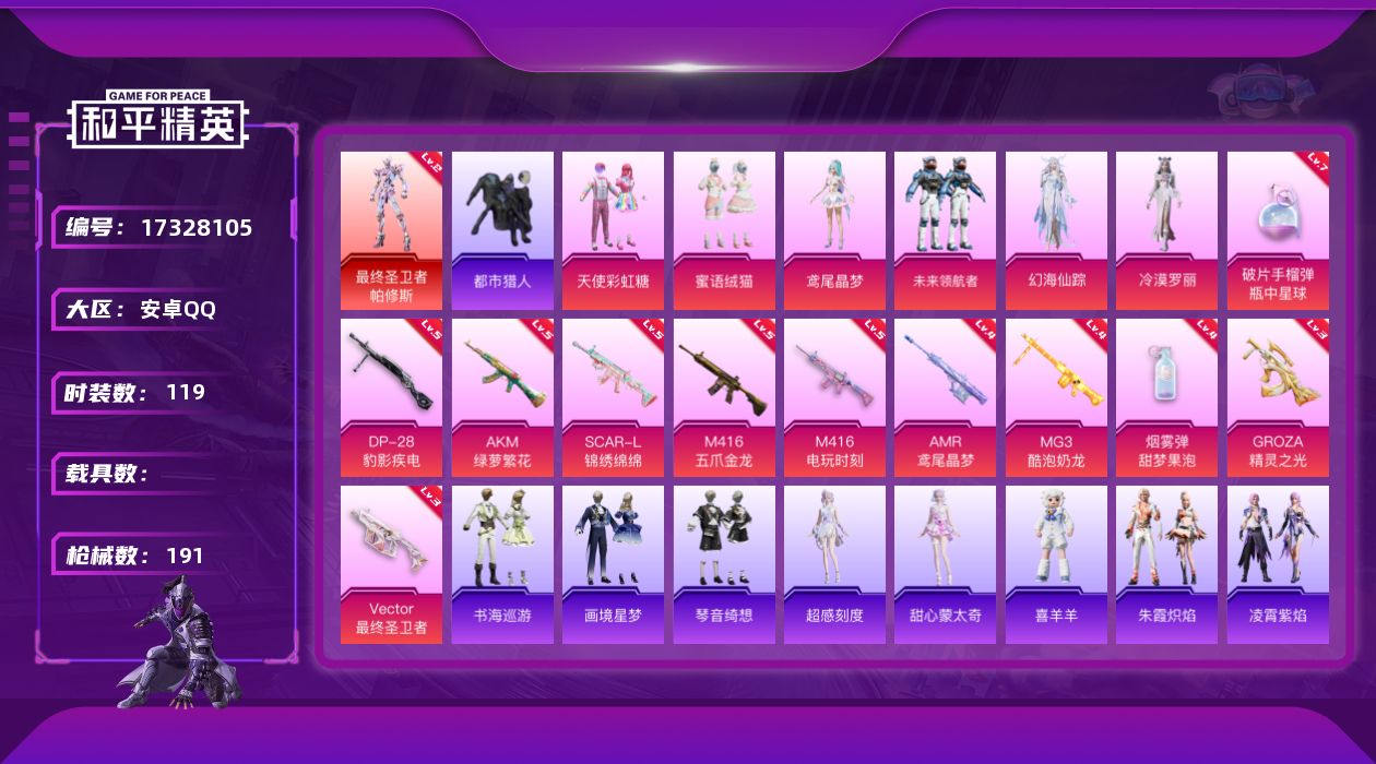 [17328105]【店主推荐捡漏号!可直接换绑】安卓 手Q-1神装-6粉装-15特效枪-0载具-9粉色飞行器-67769热力值-10王牌印记-119套装-191枪皮【红色神装等级】:最终圣卫者-帕修斯(二级)【红色角色神装】:最终圣卫者-帕修斯【热门品类】:套装-浪漫天命,套装-都市猎人,套装-龟仙人,套装-暗影哥特,套装-红熊茄茄【粉色套装】:粉装-天使彩虹糖,粉装-蜜语绒猫,角色-鸢尾晶梦,粉装-未来领航者,角色-幻海仙踪,角色-冷漠罗丽【粉色枪皮等级】:AKM-绿萝繁花(五级),AKM-暮色玫影(三级),SCAR-L-锦绣绵绵(五级),M416-五爪金龙(五级),M416-电玩时刻(五级),GROZA-精灵之光(三级),ACE32-萌骑漫游(二级),Vector-最终圣卫者(三级),AKS-74U-森灵之息(四级),Mk14-福马献瑞(五级),AMR-鸢尾晶梦(四级),DP-28-豹影疾电(五级),MG3-酷泡奶龙(四级),烟雾弹-甜梦果泡(四级),破片手榴弹-瓶中星球(七级)【粉色载具】:僚机-圣域龙宝【粉色枪皮】:AKM-绿萝繁花,AKM-暮色玫影,SCAR-L-锦绣绵绵,M416-五爪金龙,M416-电玩时刻,GROZA-精灵之光,ACE32-萌骑漫游,Vector-最终圣卫者,AKS-74U-森灵之息,Mk14-福马献瑞,AMR-鸢尾晶梦,DP-28-豹影疾电,MG3-酷泡奶龙,烟雾弹-甜梦果泡,破片手榴弹-瓶中星球【粉色飞行器】:梦幻火箭飞行器,花傲天飞行器,龙翔九天飞行器,冠军兔兔飞行器,幻海精灵飞行器,圣域金龙飞行器,终晖之翼飞行器,灵猫魔法师飞行器