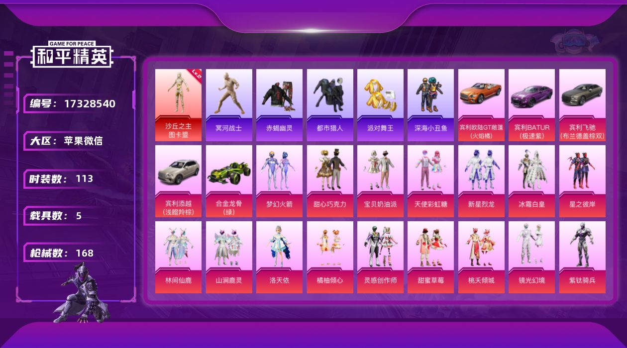 [17328540]极品素材男神号!【店主推荐捡漏号!可直接换绑】苹果 微信-无敌战神框-1神装-19粉装-13特效枪-5载具-3粉色飞行器-68853热力值-9王牌印记-113套装-168枪皮【红色神装等级】:沙丘之主-图卡盟(二级)【红色角色神装】:沙丘之主-图卡盟【热门品类】:粉装-梦幻火箭,套装-浪漫天命,套装-赤蝎幽灵,套装-都市猎人,套装-冥河战士,套装-派对舞王,套装-深海小丑鱼,套装-小丑鱼,套装-暗影哥特【粉色套装】:粉装-甜心巧克力,粉装-宝贝奶油派,粉装-天使彩虹糖,粉装-梦幻火箭,粉装-新星烈龙,粉装-冰霜白皇,粉装-星之彼岸,粉装-林间仙鹿,粉装-山涧鹿灵,角色-洛天依,粉装-橘柚倾心,粉装-灵感创作师,粉装-甜蜜草莓,粉装-桃夭倾城,粉装-镜光幻境,角色-紫钛骑兵,角色-圣堂之誓,角色-初号机 觉醒Ver.,粉装-未来领航者【粉色枪皮等级】:AKM-甜心宝贝(六级),AKM-梦之光华(一级),SCAR-L-桃夭倾城(六级),M416-五爪金龙(一级),M416-心之恋语(一级),M416-墨龙九天(六级),GROZA-精灵之光(三级),AUG-星之彼岸(六级),P90-粉樱探戈(五级),P90-沙丘之主(一级),爆炸猎弓-拳皇·狂花道(一级)【粉色载具】:宾利欧陆GT敞篷(火焰橘),宾利BATUR(极速紫),宾利飞驰(布罗德盖棕双色),宾利添越(浅瞪羚棕),合金龙骨(绿)【粉色枪皮】:AKM-甜心宝贝,AKM-梦之光华,SCAR-L-桃夭倾城,M416-五爪金龙,M416-心之恋语,M416-墨龙九天,GROZA-精灵之光,AUG-星之彼岸,P90-粉樱探戈,P90-沙丘之主,爆炸猎弓-拳皇·狂花道,烟雾弹-猫咪绅士,破片手榴弹-秋玉花灯【粉色飞行器】:纯梦嫁纱飞行翼,沙丘之主天马,龙翔九天飞行器